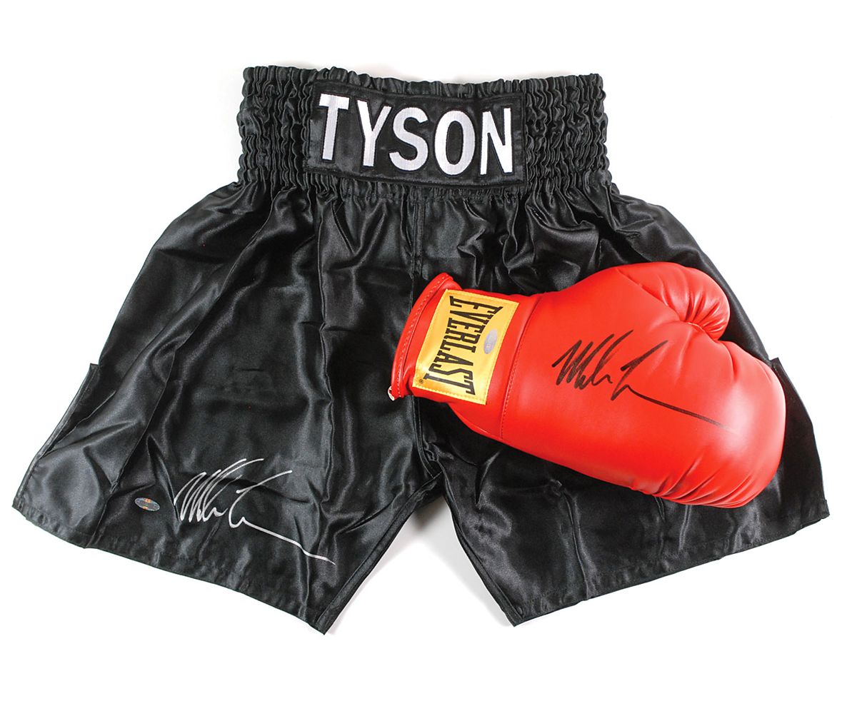 Two items: red leather Everlast right-hand boxing glove, signed across the top in black felt tip; and a pair of black boxing trunks, signed on the front in silver ink. In very fine condition. Both are accompanied by certificates of authenticity from Steiner.