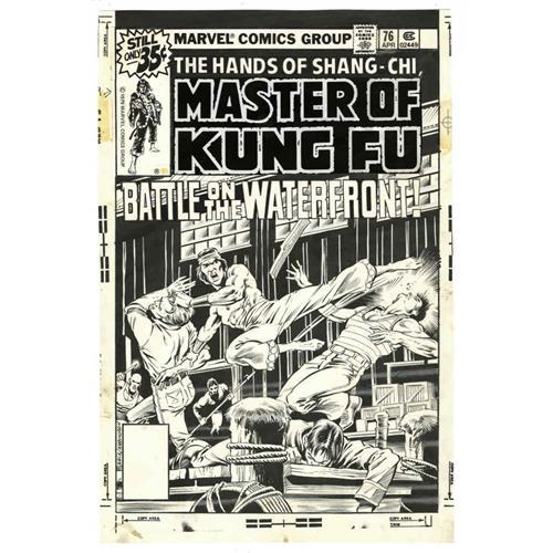 <B>Mike Zeck and Joe Rubinstein - Master of Kung Fu #76 Cover Original Art (Marvel, 1976).</B></I> A lot of sons have no interest in following in their father's footsteps. Of course, when your father happens to be the insidious Dr. Fu Manchu, and you were raised to be the perfect assassin, things get a little more complicated. This big action cover illustration, penciled by Mike Zeck and inked by Joe Rubinstein, features Shang-Chi letting his feet do the talking in a waterfront brawl. The art includes all the original logo and masthead paste-ups. The image area of the art measures 10" x 15", and the condition is Excellent.