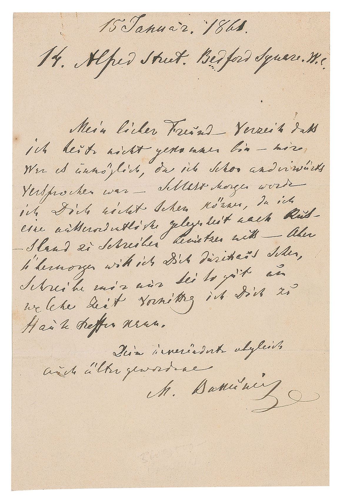 Russian revolutionary who was a principal founder of the 'social anarchist' tradition (1814–1876) ALS in German, signed “M. Bakunin,” one page, 4.5 x 6.5, January 15, 1861. Letter written from London, in full (translated): "Please excuse me for not coming today, but it was impossible for me, as I was already committed elsewhere. Even tomorrow I will not be able to see you, as I want to take advantage of an extraordinary opportunity to write to Russia. But the day after tomorrow I certainly want to see your home. Your unchanged, if older, M. Bakunin." In fine condition, with trimmed edges.