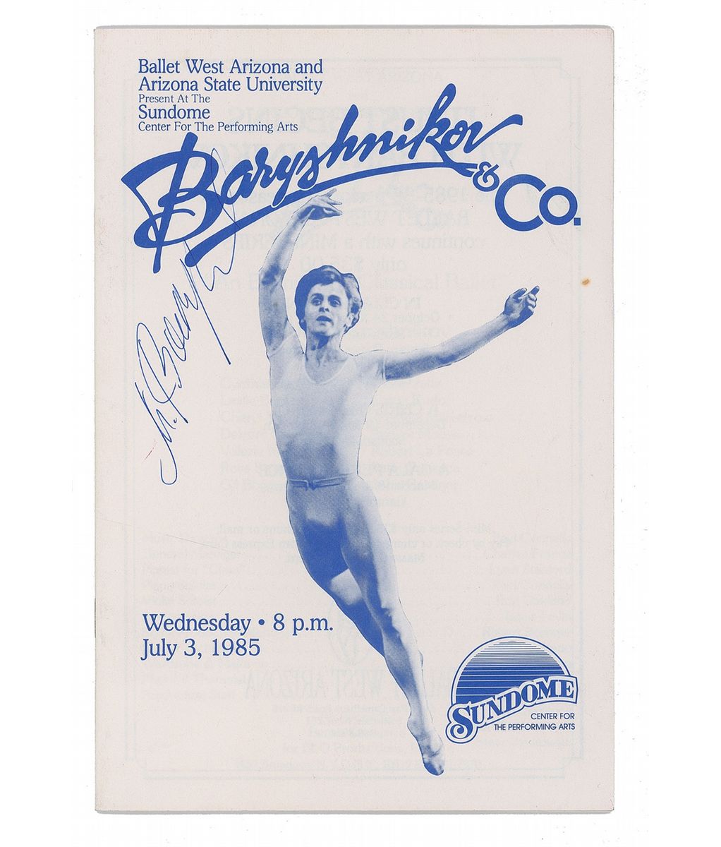 Program for the Baryshnikov & Co. Performance at the Sundome in Arizona on July 3, 1985, 6 x 9, signed on the front cover in blue ballpoint, “M. Baryshnikov.” In fine condition, with a trivial spot to right edge.