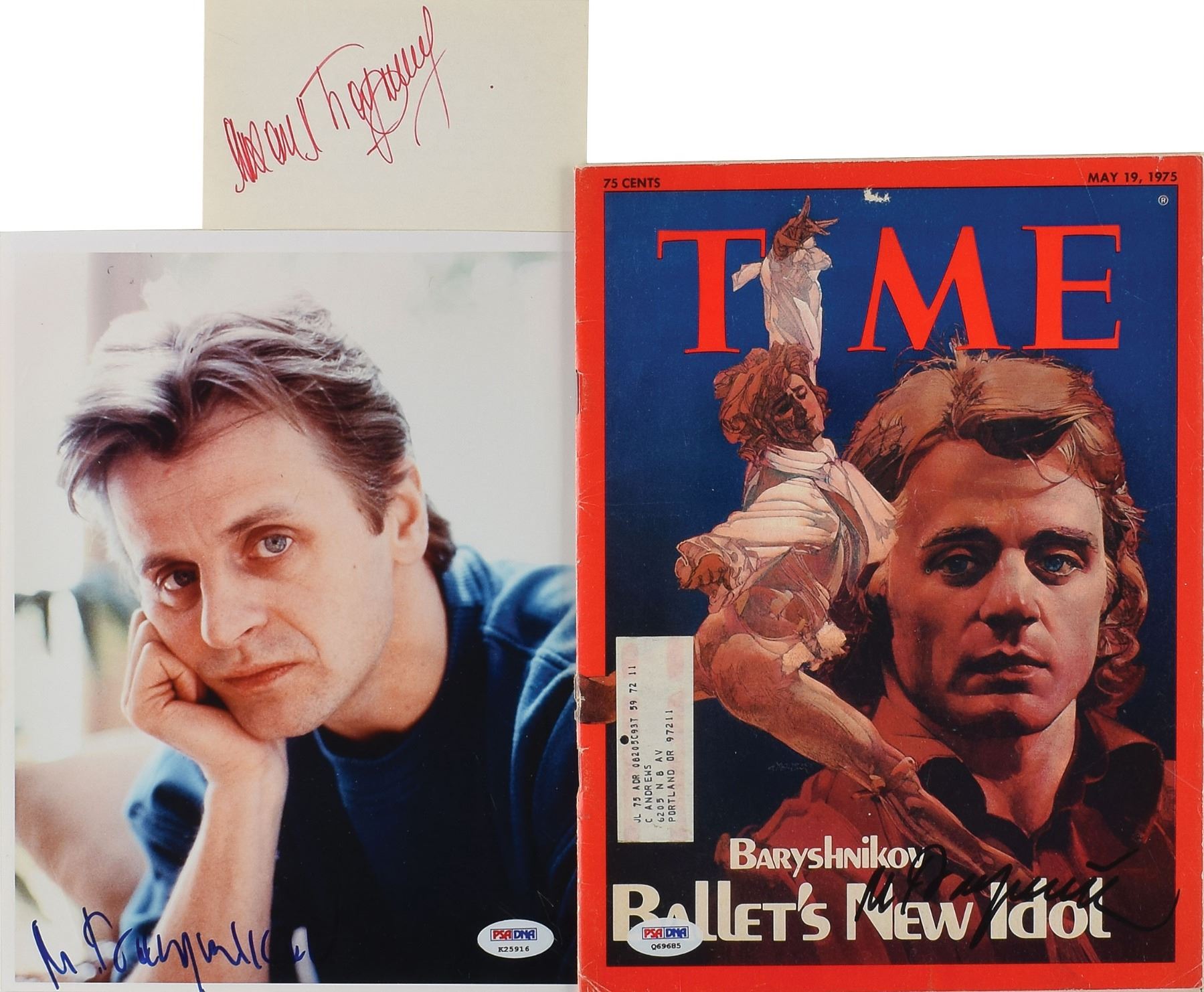 Three items signed by the great dancer: a glossy 8 x 10 close-up photo, signed along the bottom in blue felt tip; an issue of Time magazine from May 1975, signed on the front cover in black felt tip; and a red felt tip signature on an off-white 5 x 3 card. In fine condition, with PSA/DNA labels affixed to the corners of the photo and magazine. Accompanied by certificates of authenticity from PSA/DNA for the photo and magazine.