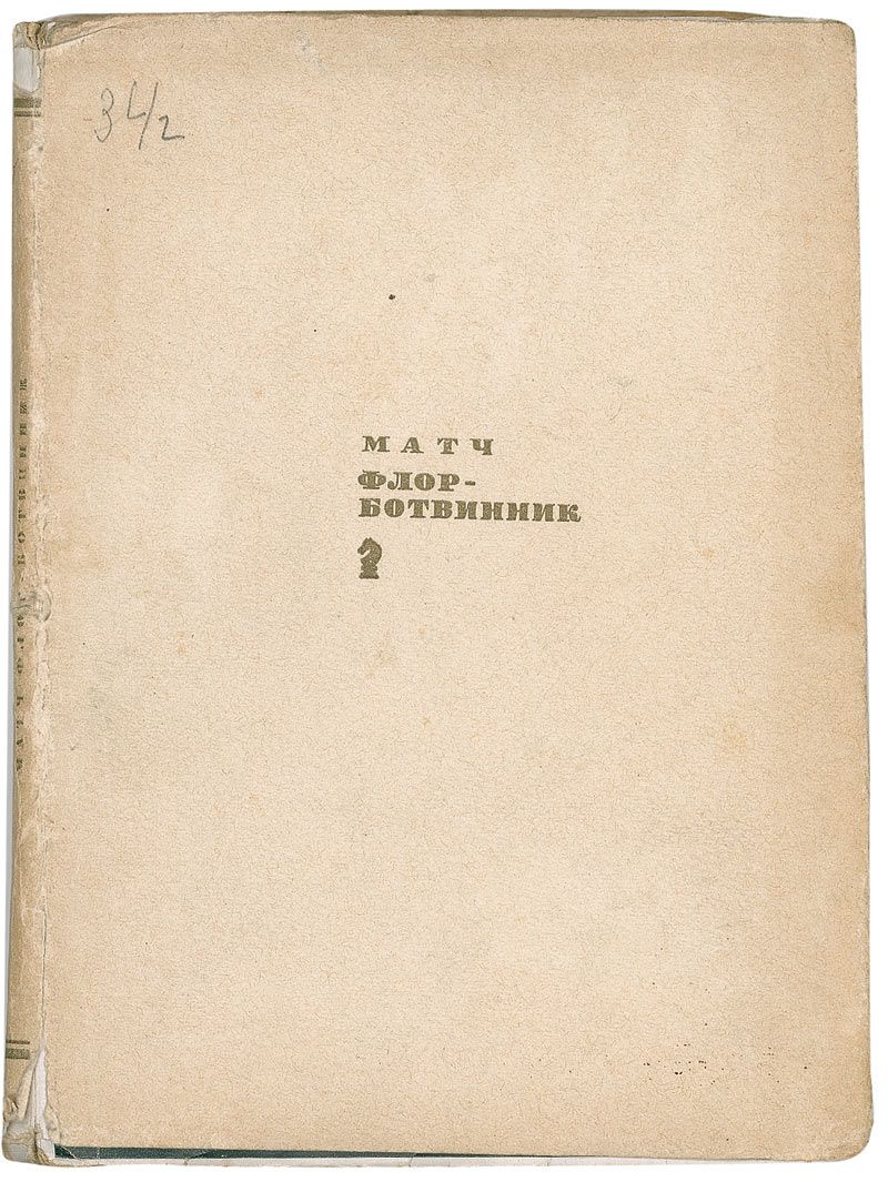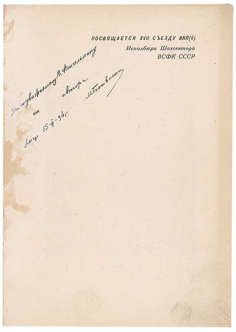 Russian International Grandmaster and three-time World Chess Champion 1911–1995). Russian chess book, 5.5 x 7, softcover, signed and inscribed in black ink on the half-title page by Botvinnik, in Russian, and dated 1934. Mostly detached spine, signed page almost detached from binding, soiling, partial separations, notations and stamps to outer covering, and a few ink marks inside, otherwise very good condition.