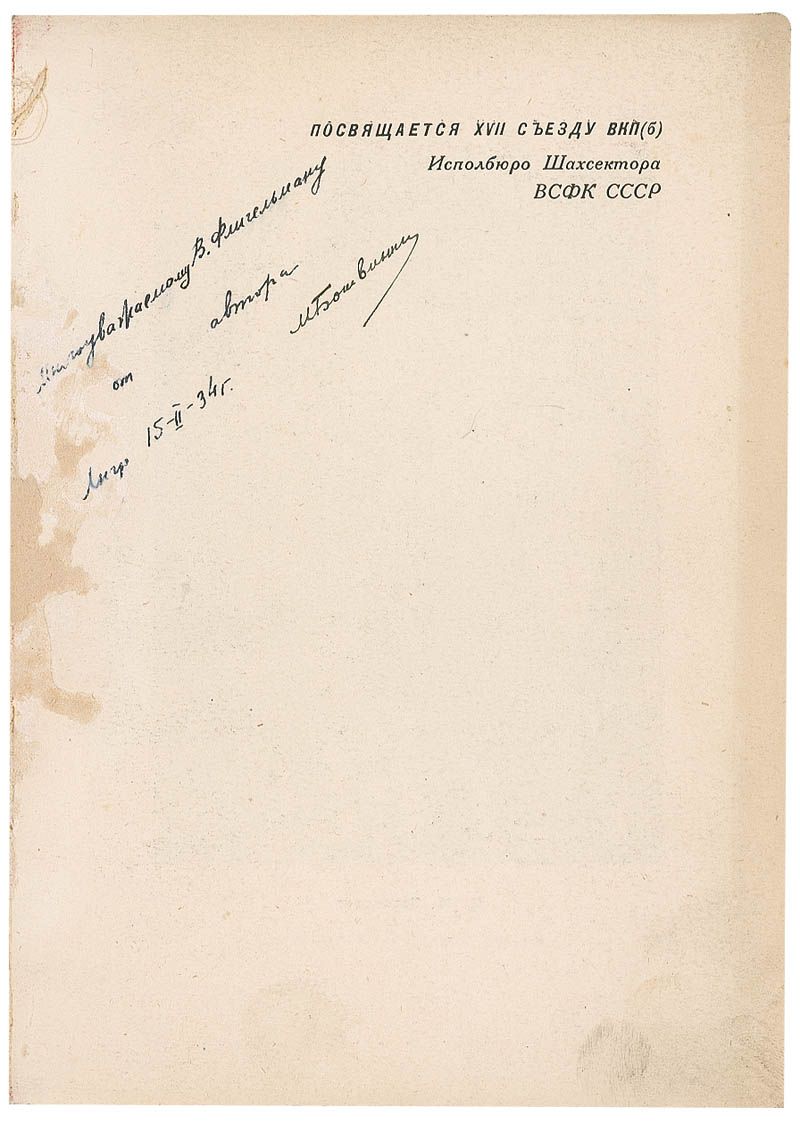 Russian International Grandmaster and three-time World Chess Champion (1911–1995). Russian chess book, 5.5 x 7, softcover, signed and inscribed in black ink on the half-title page by Botvinnik, in Russian, and dated 1934. Mostly detached spine, signed page almost detached from binding, soiling, partial separations, notations and stamps to outer covering, and a few ink marks inside, otherwise very good condition.