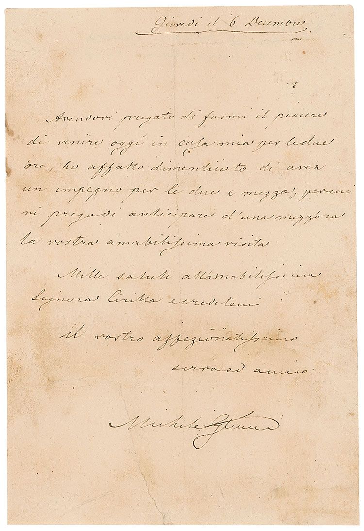 Beautifully penned ALS in Italian, signed, “Michele Glinka” (the Italian version of ‘Mikhail’), to Isidoro Cambiasi, December 6 [1832], one page, 4.75 x 7. Translated in full: “When I asked you to give me the pleasure of coming to my house at two, I had forgotten I had an appointment at two thirty. I therefore beg you to anticipate a half hour your very kind visit. A thousand salutations to your very kind wife Cirilla.” In very good condition, with light intersecting folds, scattered moderate surface creasing, uniform toning, some scattered light spots of soiling, and a professionally repaired tear towards the bottom edge. Glinka’s letters written in Russia have generally not entered into circulation, making his foreign correspondences the only obtainable Glinka letters. This piece, written during his brief three-year stay in Italy to his friend and music critic Isidoro Cambiasi, who mediated Glinka’s relationship with his musical publisher, the famous Ricordi house, is the only one we have ever offered!