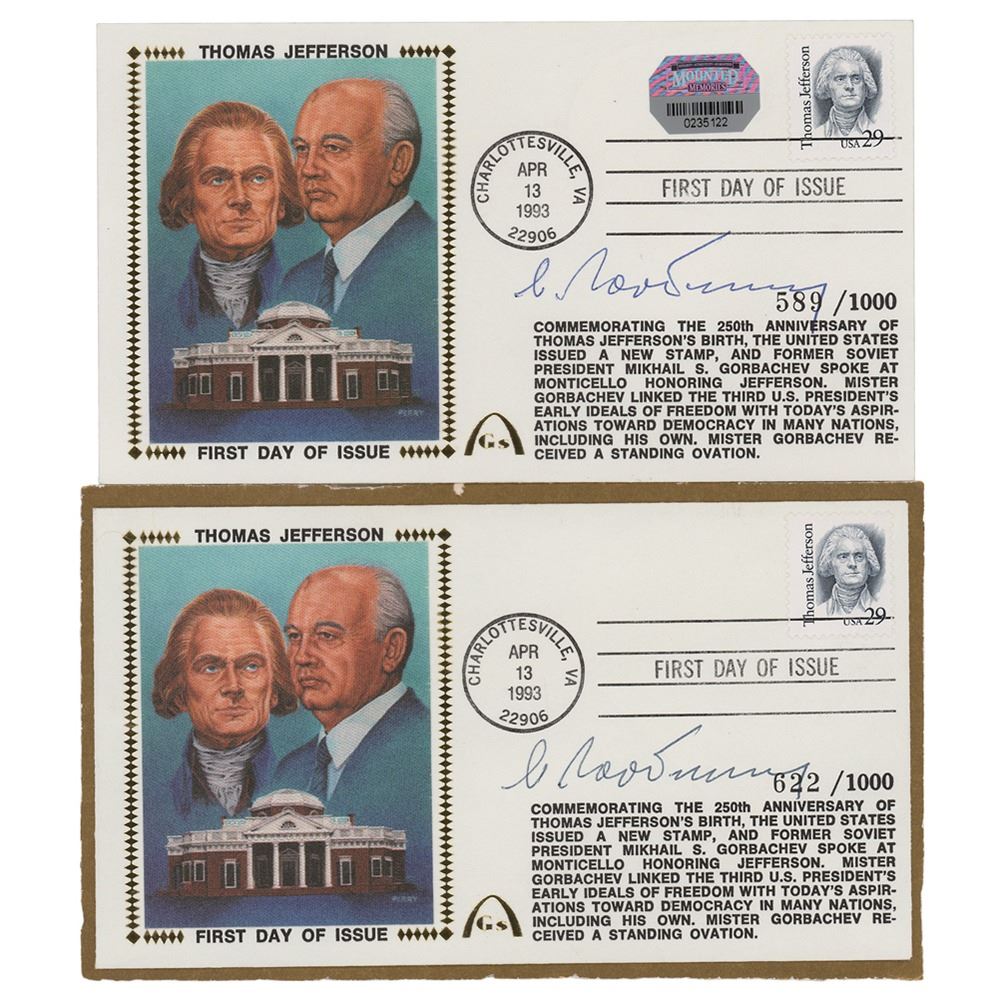 Two limited edition Gateway covers with silk cachets honoring Gorbachev and the 250th anniversary of Thomas Jefferson's birth, numbered 589 and 622/1500, both signed in blue ballpoint by Mikhail Gorbachev. In overall fine condition, with a Mounted Memories hologram affixed to one, and the other affixed to a slightly larger card.