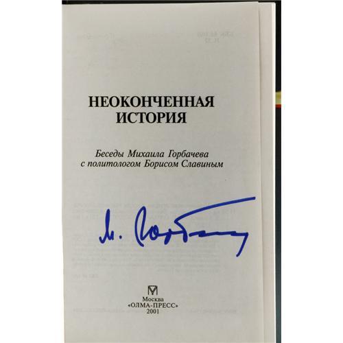 <B>Mikhail Gorbachev Signed Autobiography</B></I> From the former leader of the Soviet Union, and the man who justifiably received a Nobel Peace prize for his unique contributions to the end of the Cold War, comes his personally signed autobiography. With a publishing date of 2001 in Moscow, <I>The Unfinished Story: Conversations with Mikhail Gorbachev</B></I> is written entirely in his native Russian language and signed in Cyrillic form. A man who may well grow in historical stature as the years pass and the fruits of his efforts become more apparent, this is a very desirable addition to any collection of truly notable world figures. Bearing the bold and clear signature of a relatively inaccessible author, this is a nice piece.