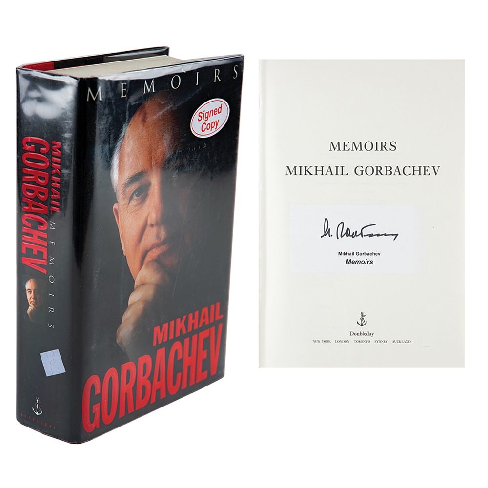 Signed book: Memoirs. First edition. NY: Doubleday, 1996. Hardcover with dust jacket, 6.5 x 9.5, 769 pages. Signed on a label affixed to the title page in black felt tip by Gorbachev. In fine condition.