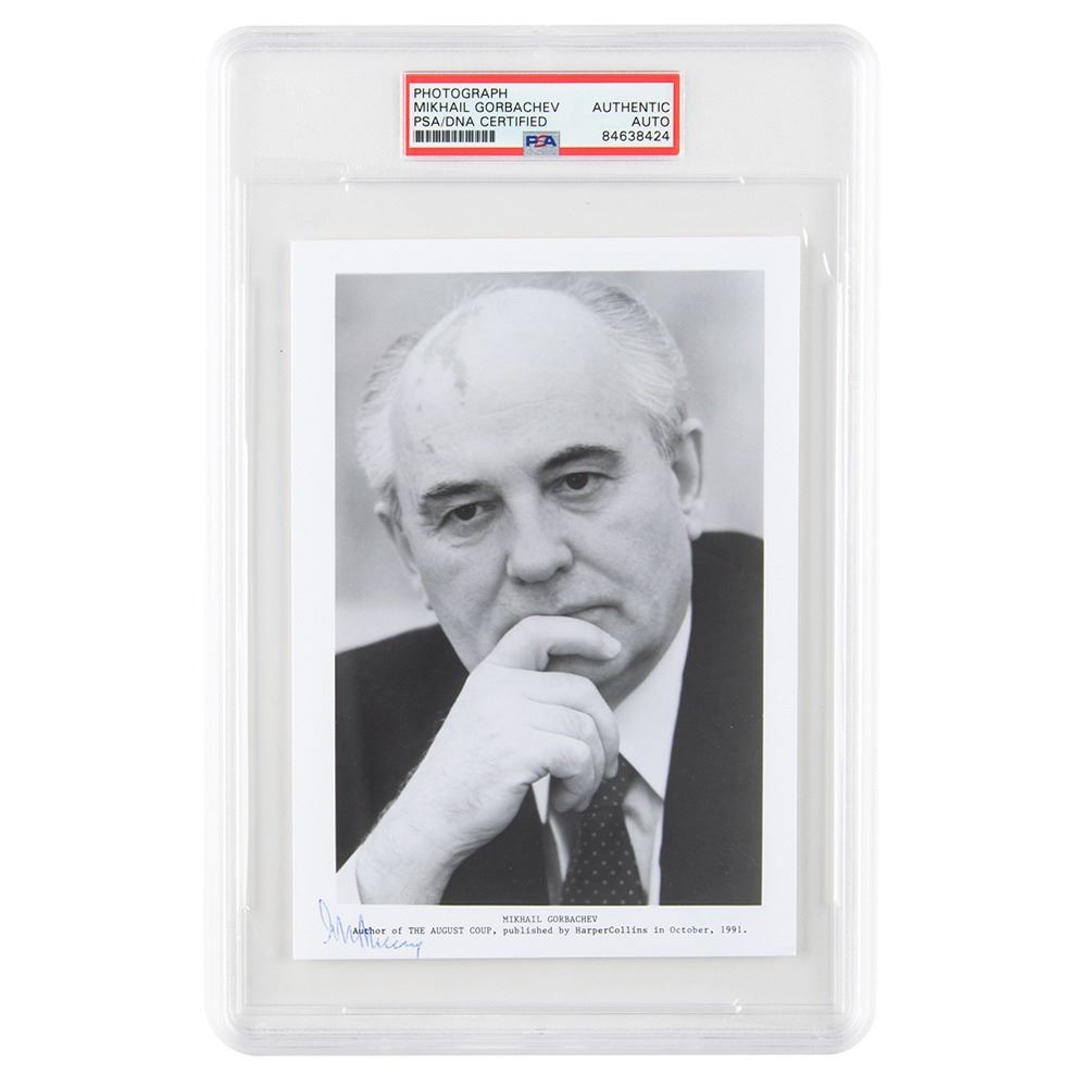 Vintage glossy 5 x 7 close-up HarperCollins publicity photo of Mikhail Gorbachev for The August Coup, signed in the lower border in blue ballpoint. In fine condition. Encapsulated in a PSA/DNA authentication holder.