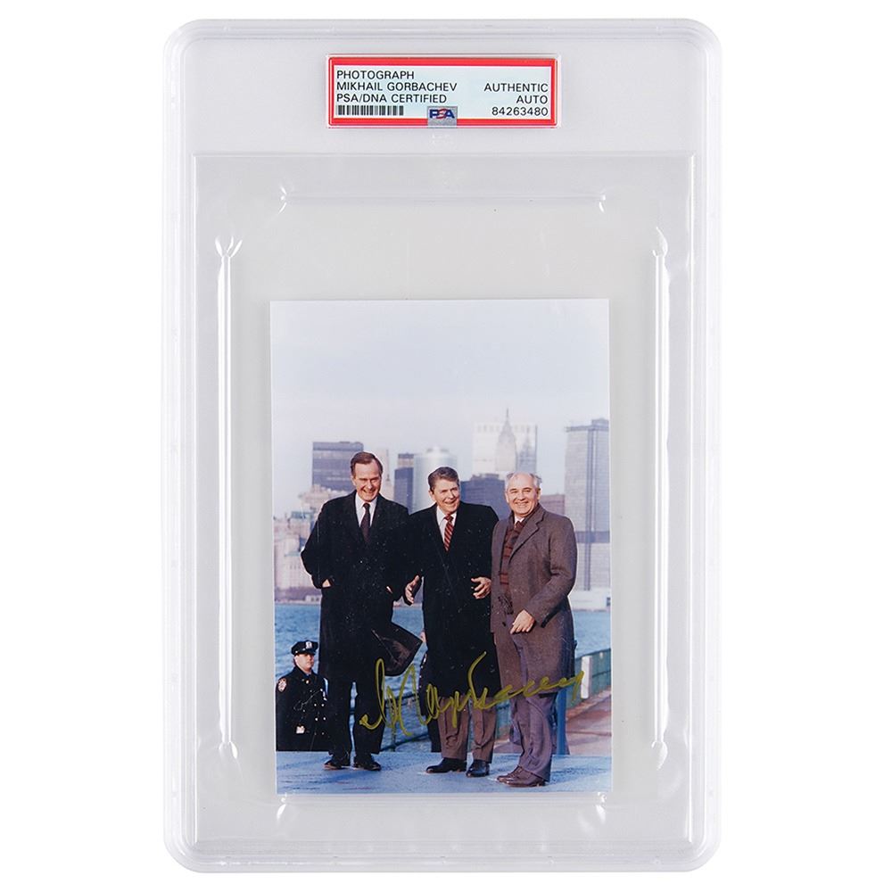 Color glossy 4 x 5.75 photo of Mikhail Gorbachev meeting with President Ronald Reagan and Vice President George Bush during the Governors Island Summit in December 1988, signed in gold ink by Gorbachev. In fine condition. Encapsulated in a PSA/DNA authentication holder.