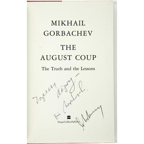 <B>Mikhail Gorbachev. </B></I><B><I>The August Coup</B></I></B></I> <I>The Truth and the Lessons</B></I>. [London]: Harper Collins Publishers, [1991]. <BR><BR>Inscribed by Mikhail Gorbachev. Octavo. 127 pages. Several color photographic plates. <BR><BR>Publisher's red cloth covers with the spine lettered in gilt. Illustrated dust jacket. Title page inscribed by Mikhail Gorbachev. Near fine copy. <BR><BR>Published in 1991, this work is the immediate and personal response of Mikhail Sergeyevich Gorbachev (March 2, 1931) to the shocking Soviet coup d'état which took place between August 19 and 21 of 1991. <BR><BR><BR><b>Shipping:</b> Books & Catalogs (<a target="_blank" href="http://www.heritageauctions.com/common/shipping.php">view shipping information</a>)