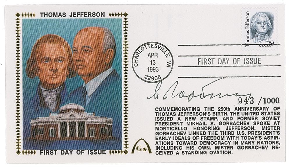 Limited edition Gateway FDC with a color silk cachet honoring Thomas Jefferson, #943/1000, signed in black ink. In very fine condition.