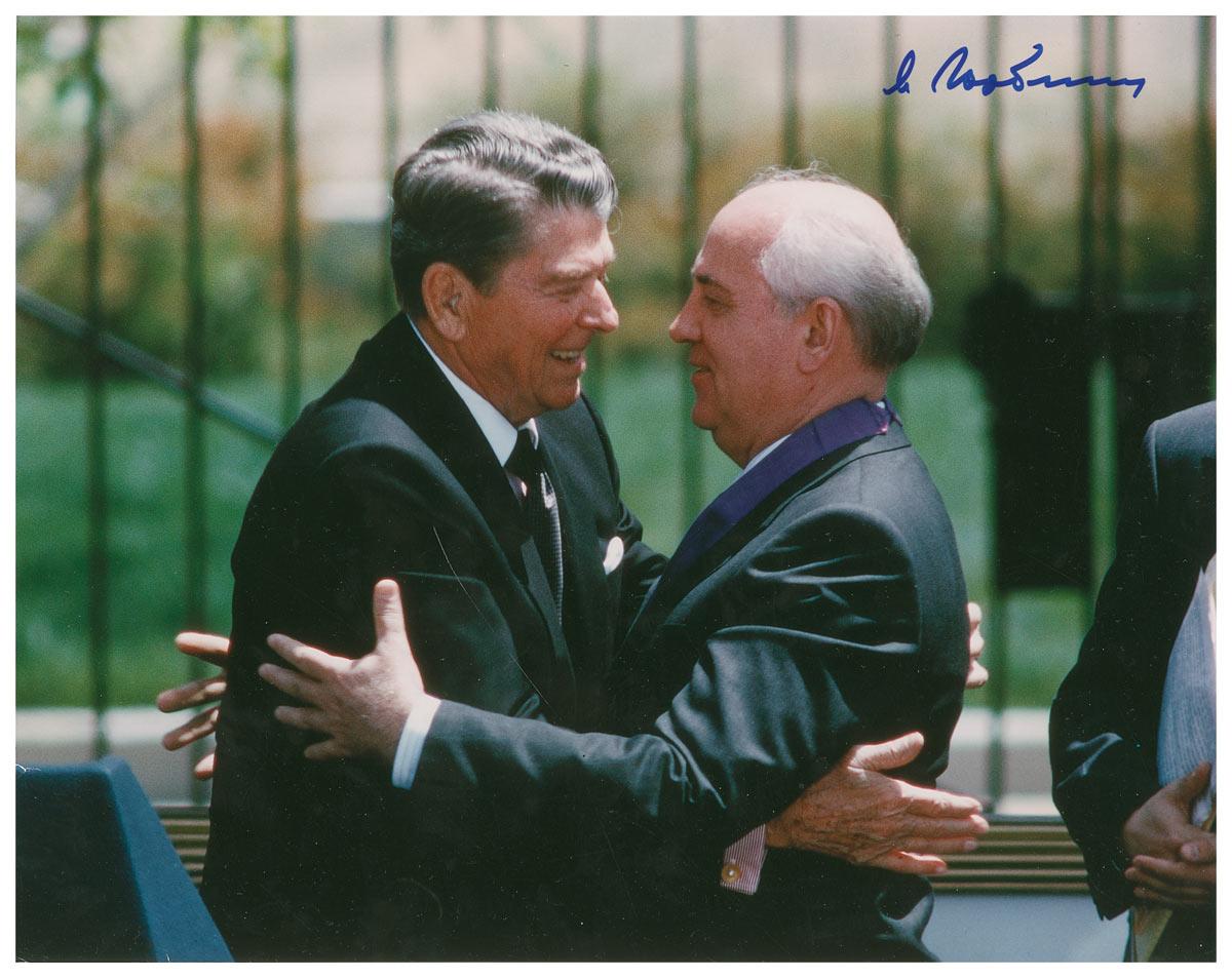 Color glossy 14 x 11 photo of Gorbachev embracing President Ronald Reagan, signed in blue felt tip by Gorbachev. In fine condition with a small tear and crease at the left border and a few handling bends, most of which can be easily matted out if so desired.