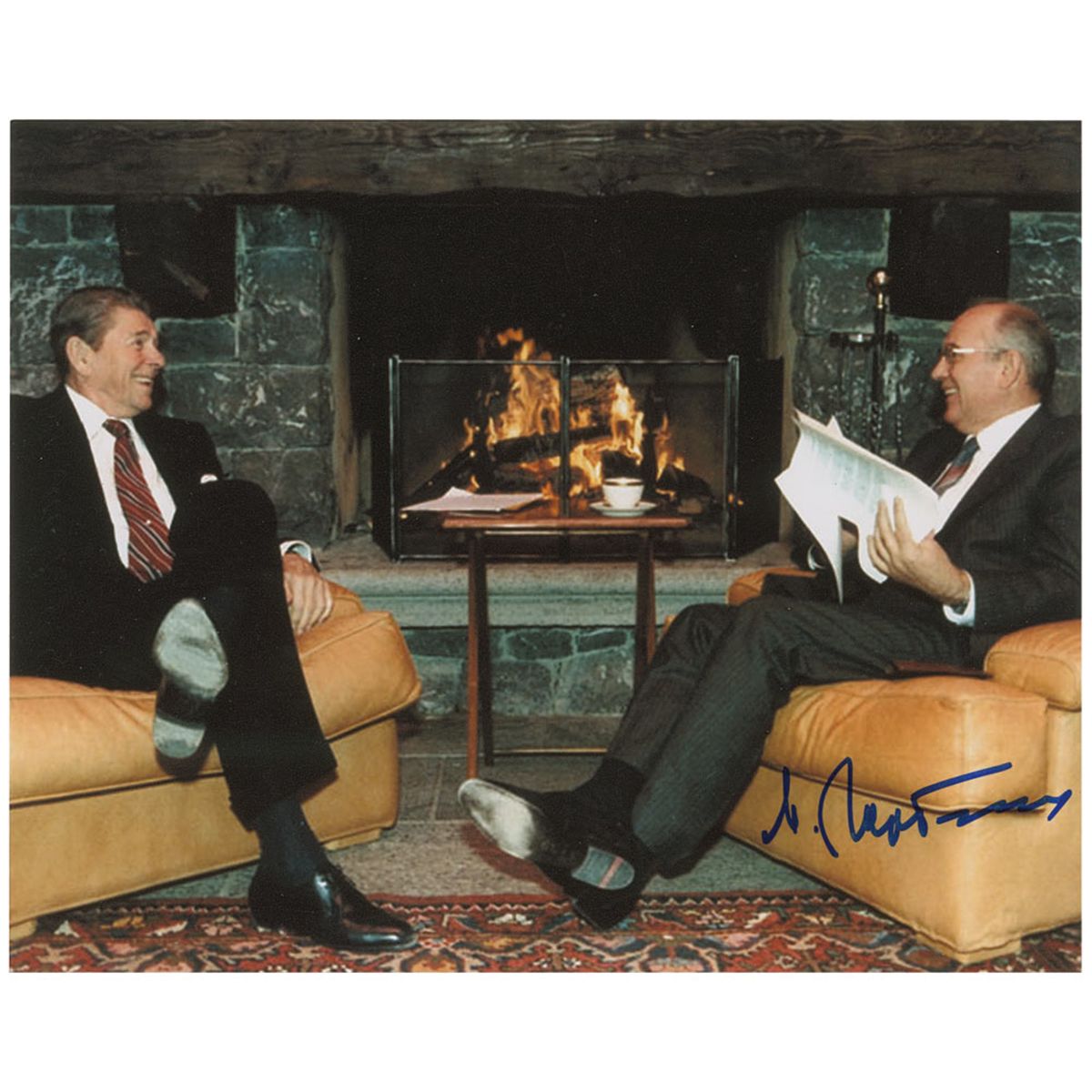 Color satin-finish 10 x 8 photo of Gorbachev with Ronald Reagan, signed in blue felt tip, “M. Gorbachev.” In fine condition, with a light horizontal bend.
