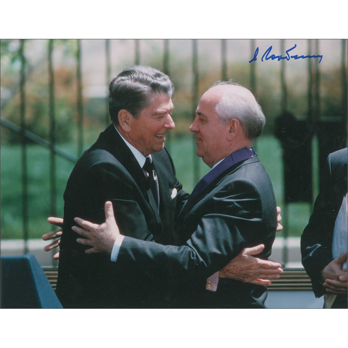 Color glossy 14 x 11 photo of Gorbachev embracing President Ronald Reagan after receiving the Ronald Reagan Freedom Award, signed in blue felt tip by Gorbachev. In fine condition.