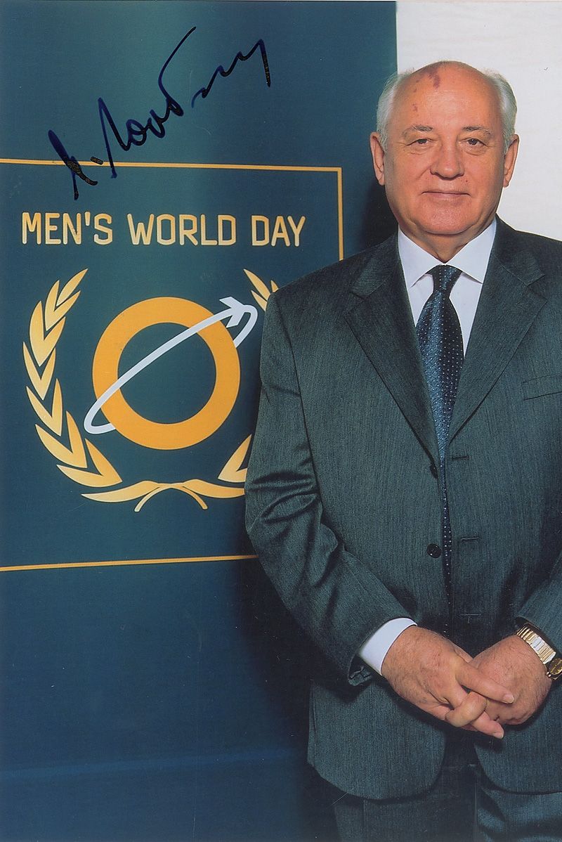 Color glossy 5.25 x 8.25 photo of Gorbachev at Men’s World Day, signed in-person in blue fountain pen, “M. Gorbachev.” In fine condition.