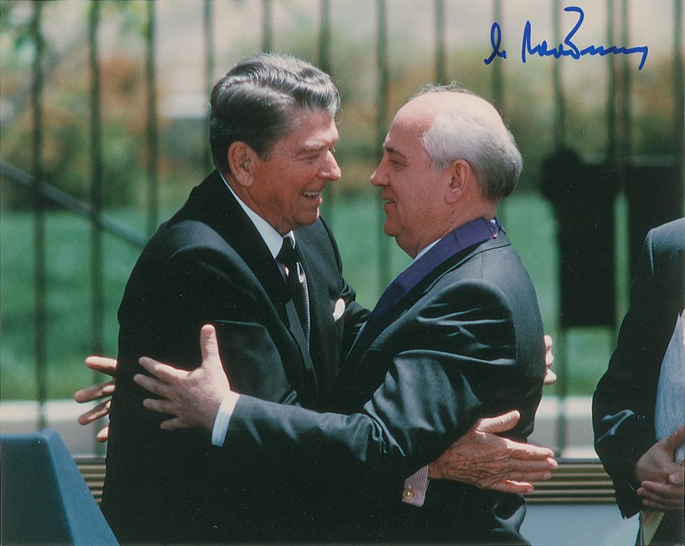 Color glossy 10 x 8 photo of Gorbachev with Ronald Reagan, signed in blue felt tip, “M. Gorbachev.” In fine condition. Accompanied by a certificate of authenticity from Score Board.