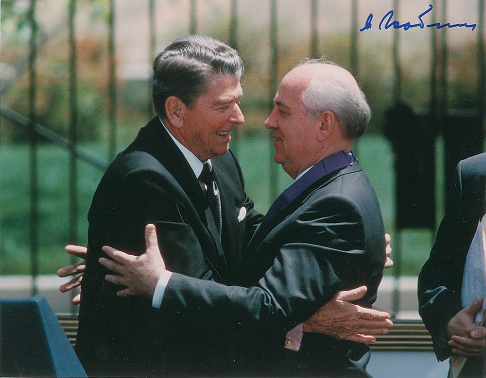 Color glossy 14 x 11 photo of Gorbachev with Ronald Reagan, signed in blue felt tip, “M. Gorbachev.” In fine condition.