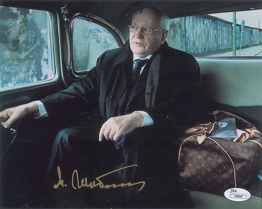 Color glossy 10 x 8 photo shot by Annie Liebovitz for a Louis Vuitton ad in 2007, showing the ever-stylish Soviet leader seated in a limousine beside his Louis Vuitton bag, riding past the Berlin Wall, signed in gold ink. In fine condition, with a JSA label affixed to the lower right. Accompanied by a certificate of authenticity from JSA.