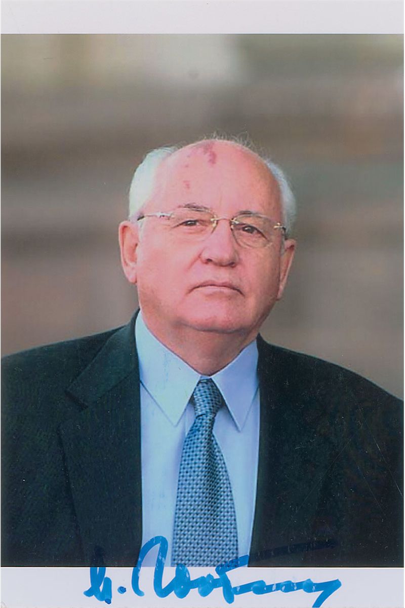 Two color photos, one 4 x 6 depicting Gorbachev alone and one 5 x 7 of him with Ronald Reagan, both signed in blue felt tip, “M. Gorbachev.” In overall fine condition.