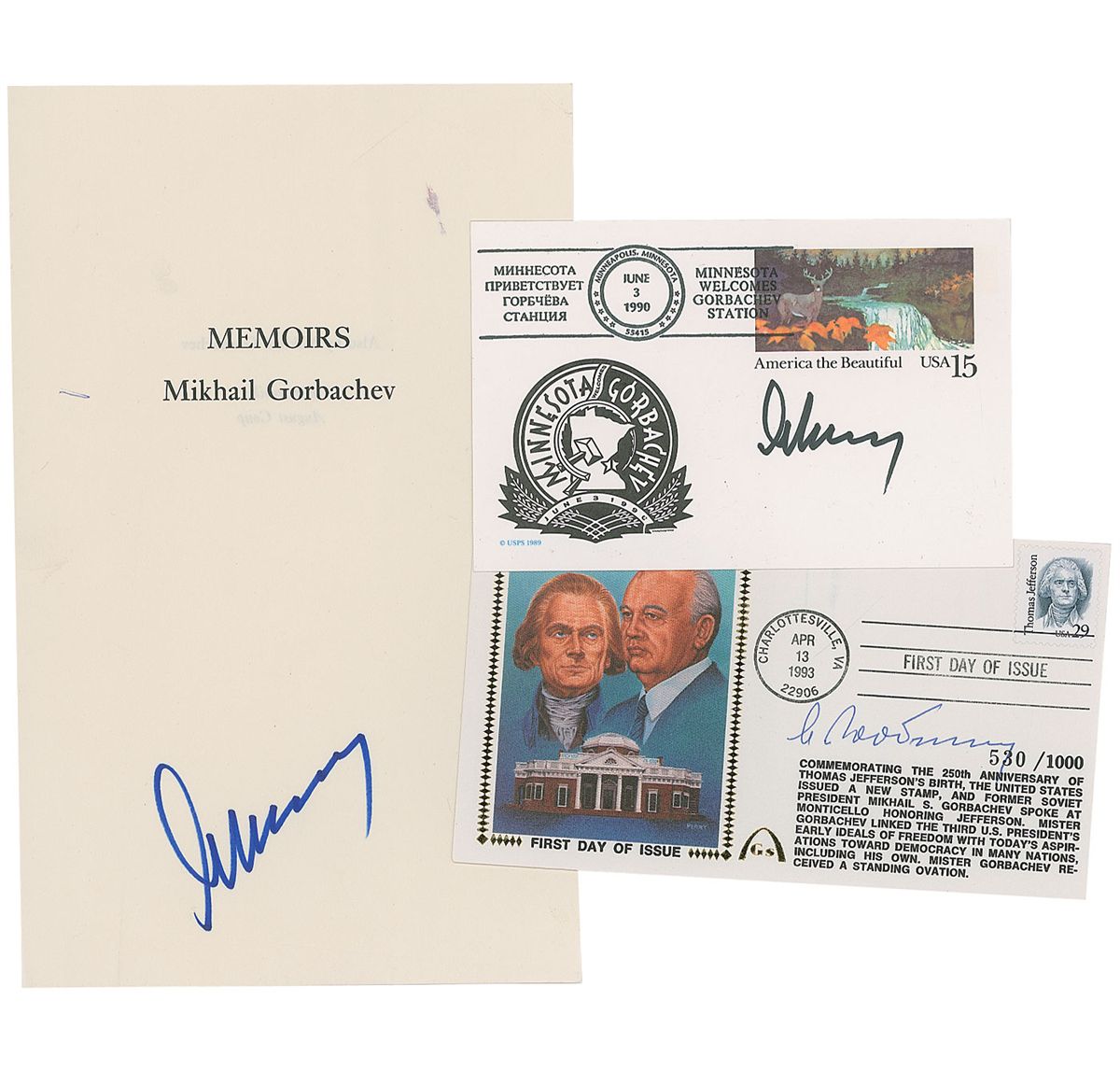 Three items: a limited edition FDC with a cachet honoring Gorbachev’s speech at Monticello to Thomas Jefferson, numbered 530/1000, signed in blue ballpoint; a commemorative philatelic card with a cachet honoring Gorbachev’s 1990 visit to Minnesota, signed in black felt tip; and a half-title page removed from Gorbachev’s Memoirs, signed in blue felt tip. In overall fine condition, with a few stray marks to the book page.