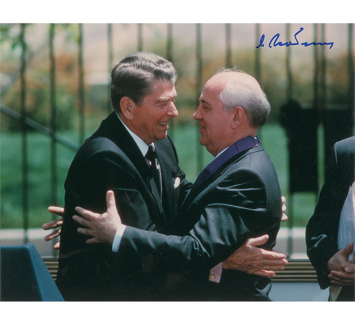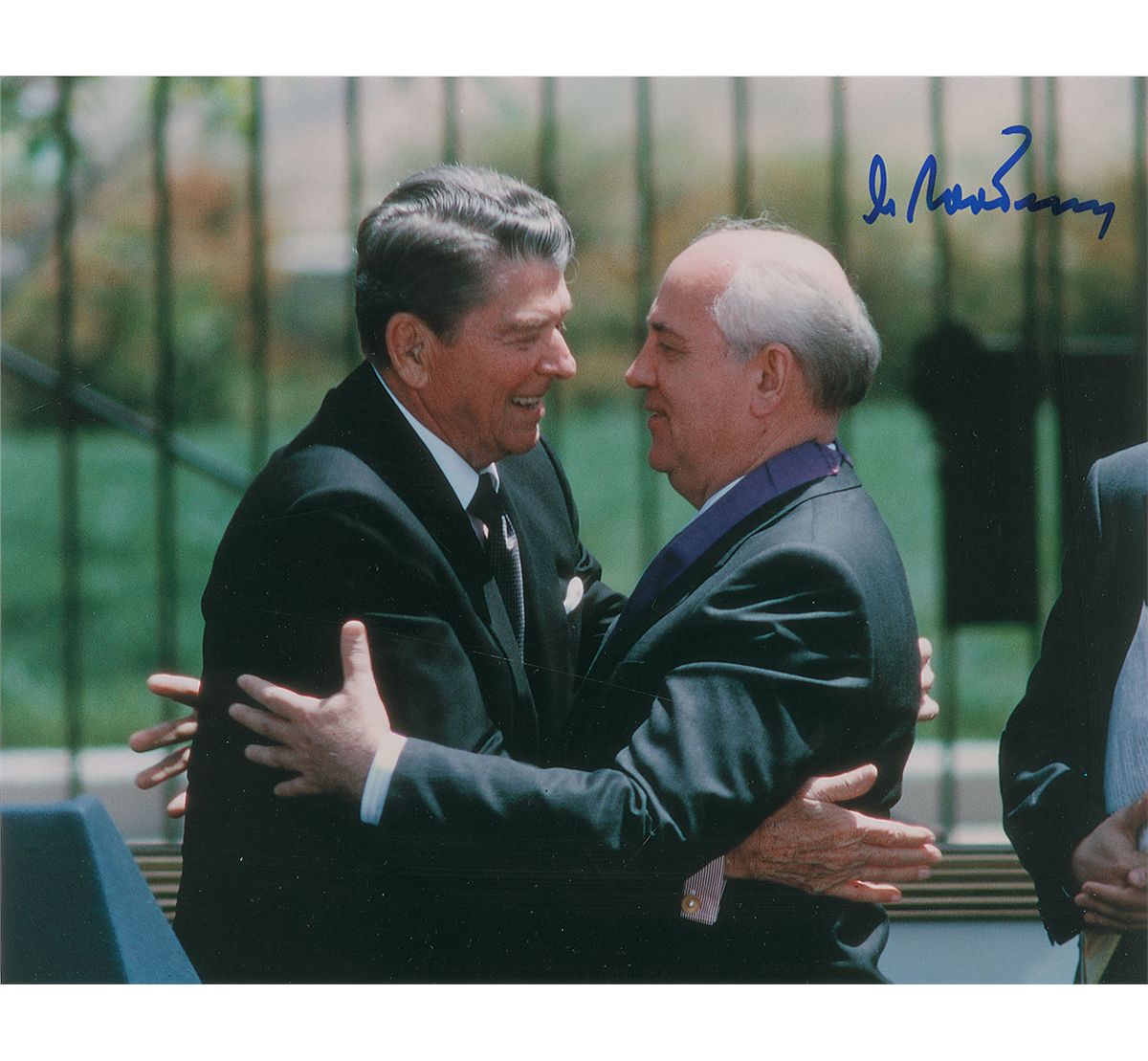 Two identical color glossy photos showing Gorbachev meeting Ronald Reagan, 10 x 8 and 14 x 11, both signed in blue felt tip. In very fine condition. Accompanied by a certificate of authenticity from Score Board for one photo.