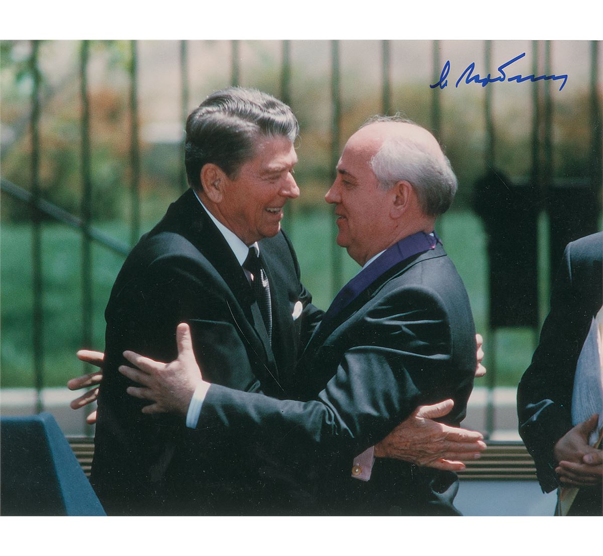 Two color glossy photos of Gorbachev embracing Ronald Reagan, 10 x 8 and 14 x 11, both signed in blue felt tip. In fine condition, with a slight crease to upper left edge of the larger image. Accompanied by a certificate of authenticity from Score Board for one photo.