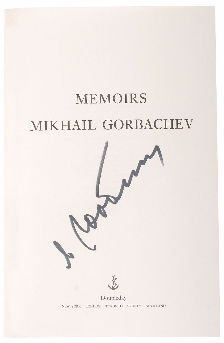Signed book: Memoirs. First edition. NY: Doubleday, 1996. Hardcover with dust jacket, 6.5 x 9.5, 769 pages. Signed on the title page in black felt tip, “M. Gorbachev.” In fine condition. Consignor notes that the signature was obtained in person at a Borders book signing on October 25, 1996.