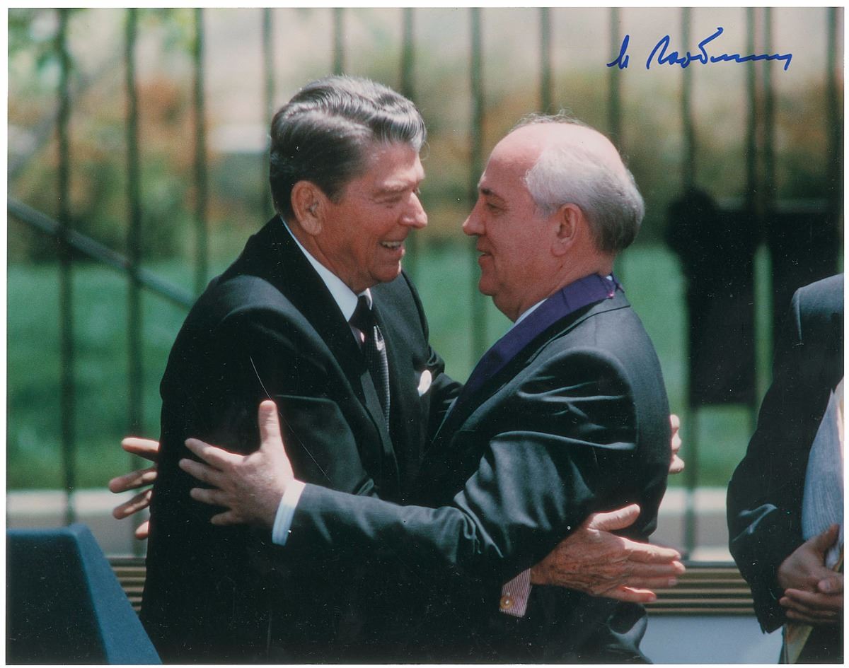 Color glossy 14 x 11 photo of Gorbachev embracing Ronald Reagan, signed in blue felt tip. In fine condition. Accompanied by a certificate of authenticity from Score Board.
