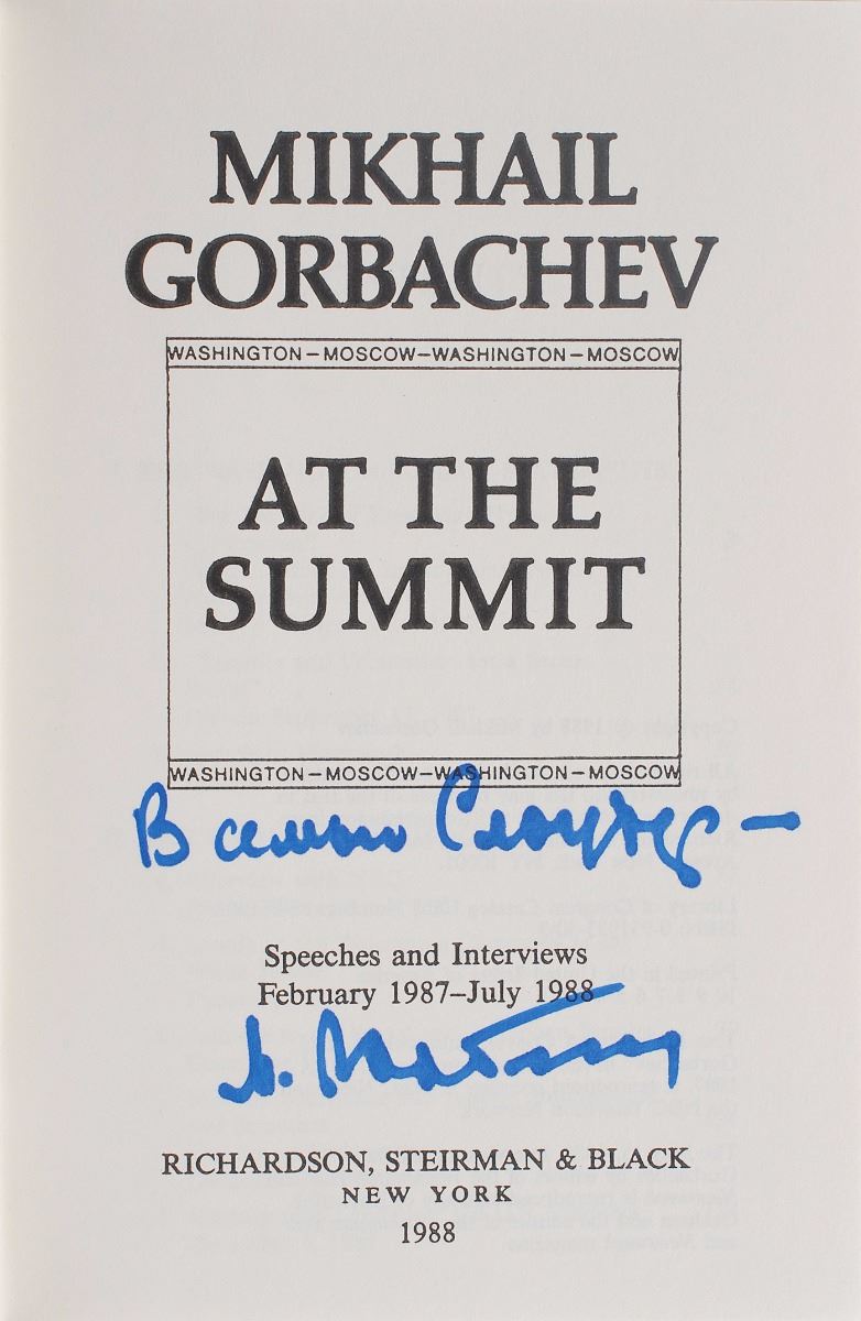 Signed book: At the Summit. First edition. NY: Richardson, Steirman & Black, 1988. Hardcover with dust jacket, 5.75 x 8.5, 298 pages. Signed in Cyrillic on the title page in blue felt tip, “M. Gorbachev.” In fine condition.