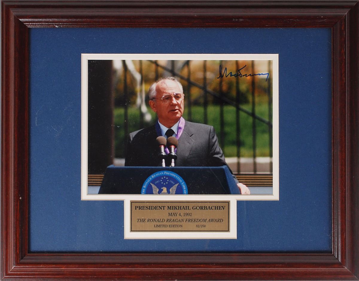 Limited edition color glossy 9.5 x 6.75 photo of Gorbachev following his acceptance of the first ever Ronald Reagan Freedom Award at the Reagan Library on May 4, 1992, numbered 82/250, signed in the upper right corner in blue felt tip. Framed with an engraved nameplate. In fine condition.