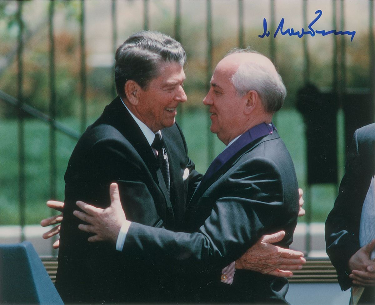 Color glossy 10 x 7.75 photo of Gorbachev embracing Ronald Reagan, signed in blue felt tip, “M. Gorbachev.” In fine condition. Accompanied by a certificate of authenticity from Score Board.