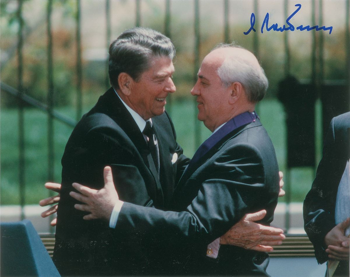 Color glossy 10 x 7.75 photo of Gorbachev embracing Ronald Reagan, signed in blue felt tip by Gorbachev. In fine condition, with trivial soiling and an evenly trimmed bottom edge. Accompanied by a certificate of authenticity from Score Board.