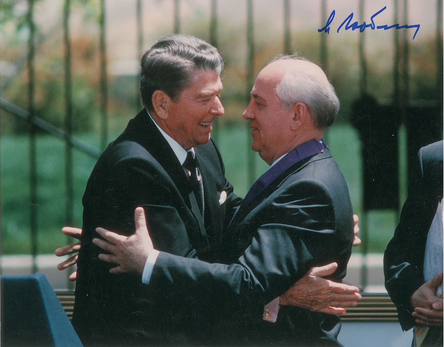 Color glossy 14 x 11 photo of Gorbachev embracing Ronald Reagan, signed in blue felt tip. In fine condition, with some creasing to the left side.