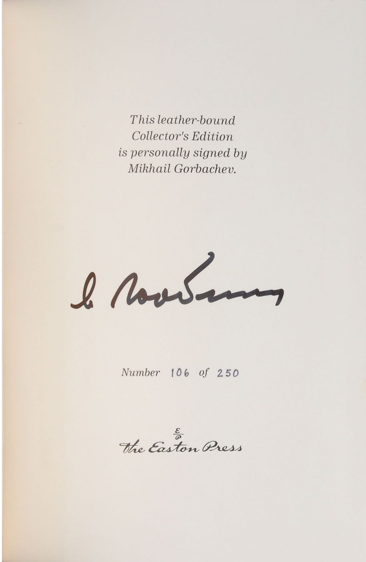 Uncommon signed book: Perestroika. Collector's edition, limited issue, numbered 106/250. Norwalk, CT: The Easton Press, 1994. Leatherbound hardcover with slipcase, 6.25 x 9.25, 254 pages. Signed on the colophon in thick black felt tip by Gorbachev. In fine condition.