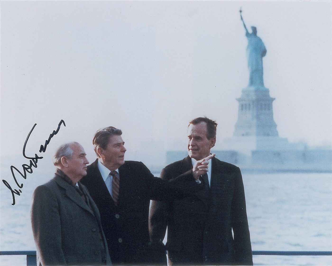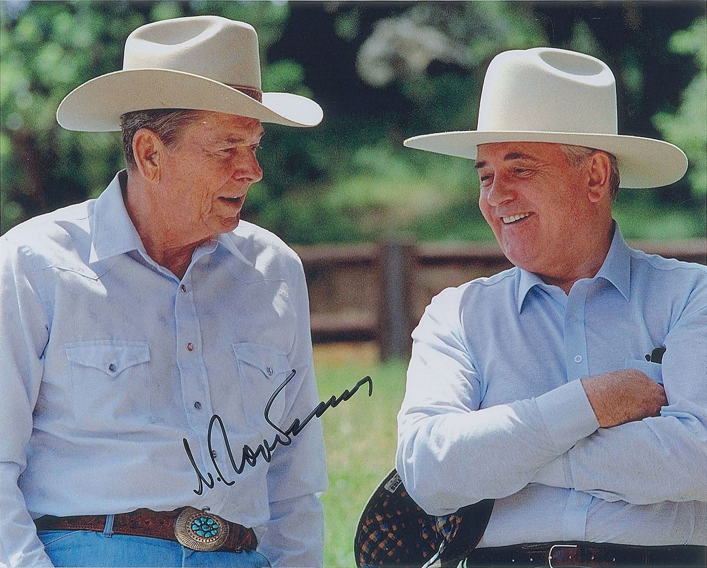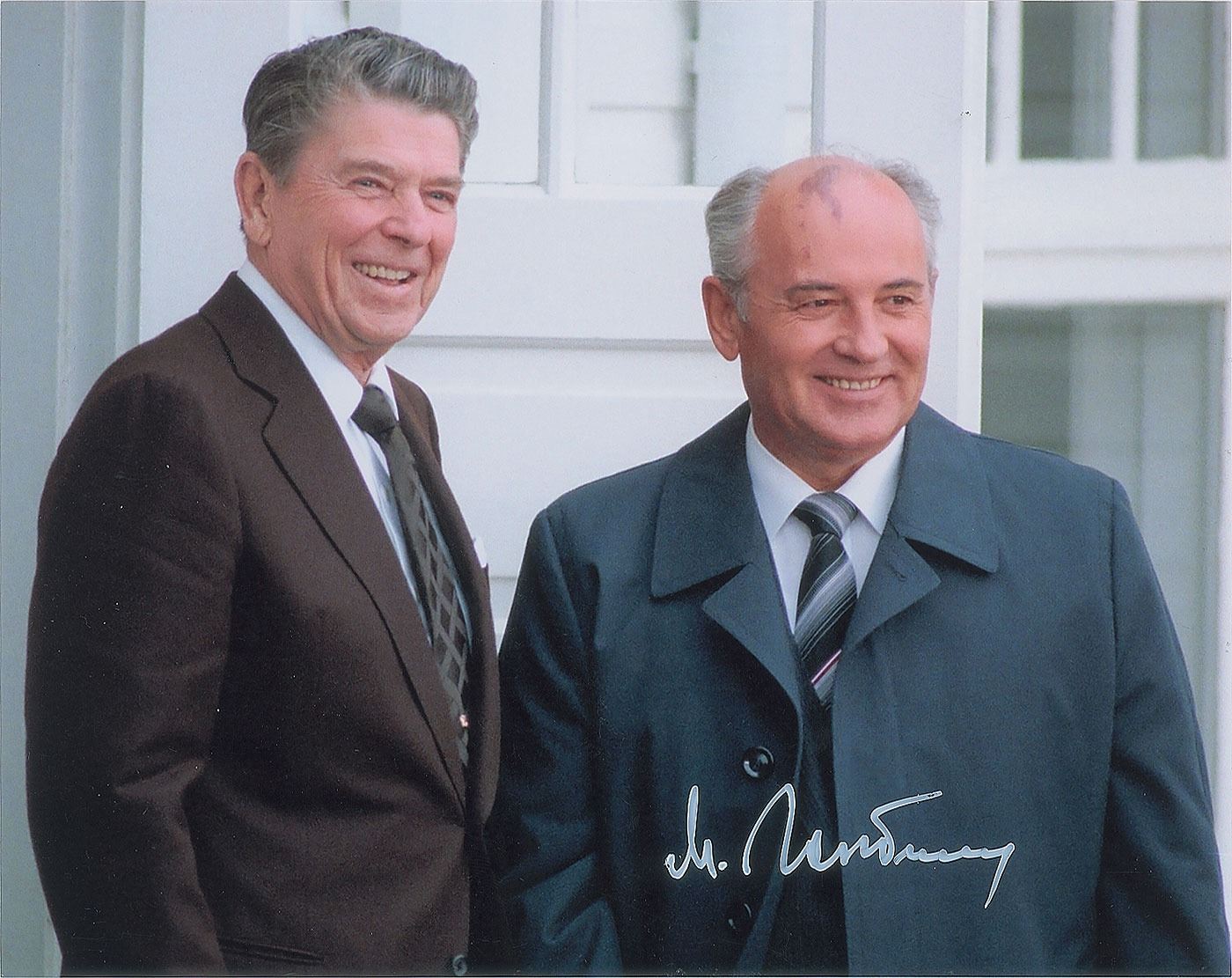 Three color glossy 10 x 8 photos of Mikhail Gorbachev alongside Ronald Reagan, each signed in white paint pen or black felt tip by the former president of the Soviet Union. In overall fine condition.