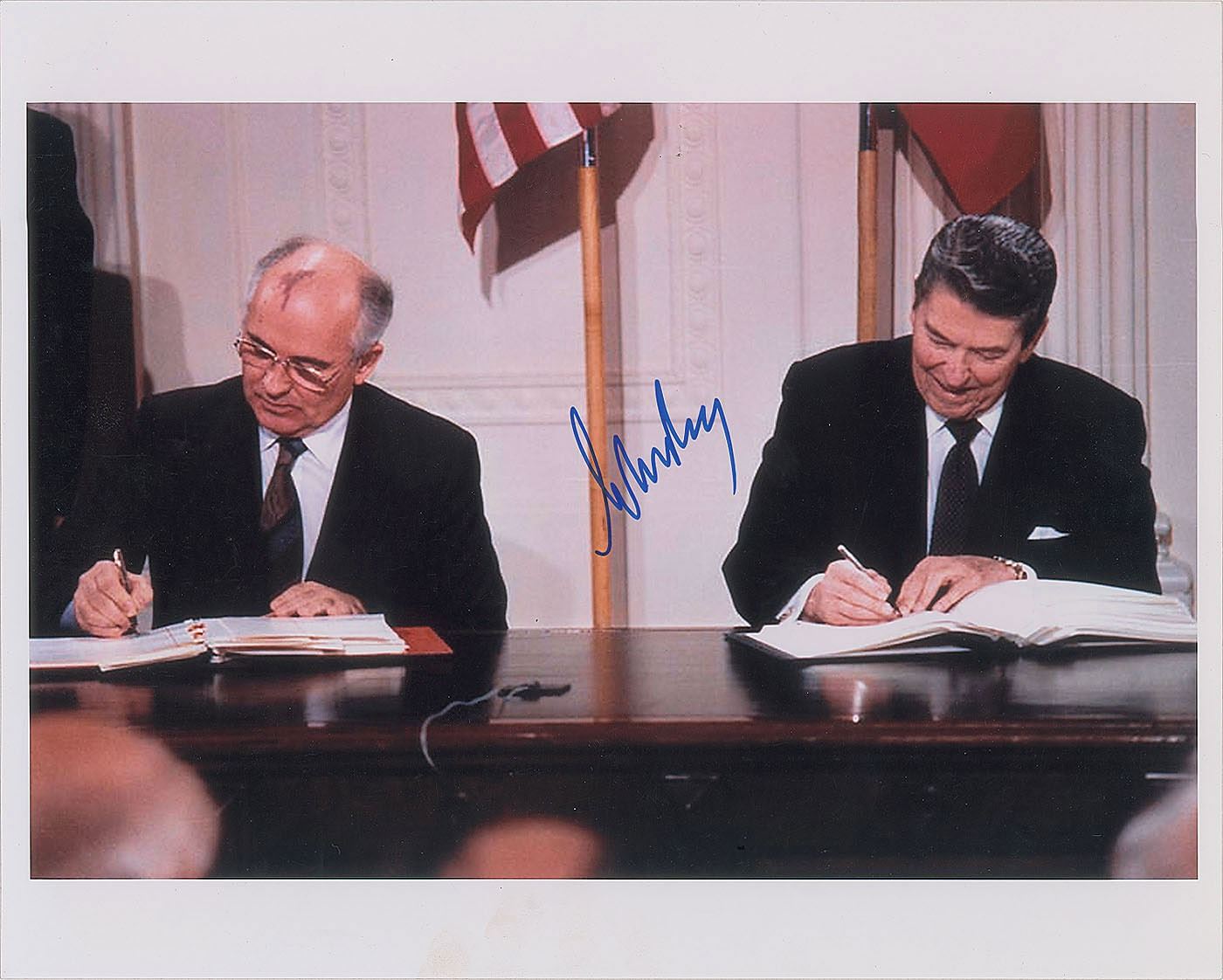 Color satin-finish 15 x 12 photo of Gorbachev and Reagan signing the Intermediate-Range Nuclear Forces Treaty on December 8, 1987, signed in blue felt tip by the former Soviet leader. In fine condition.
