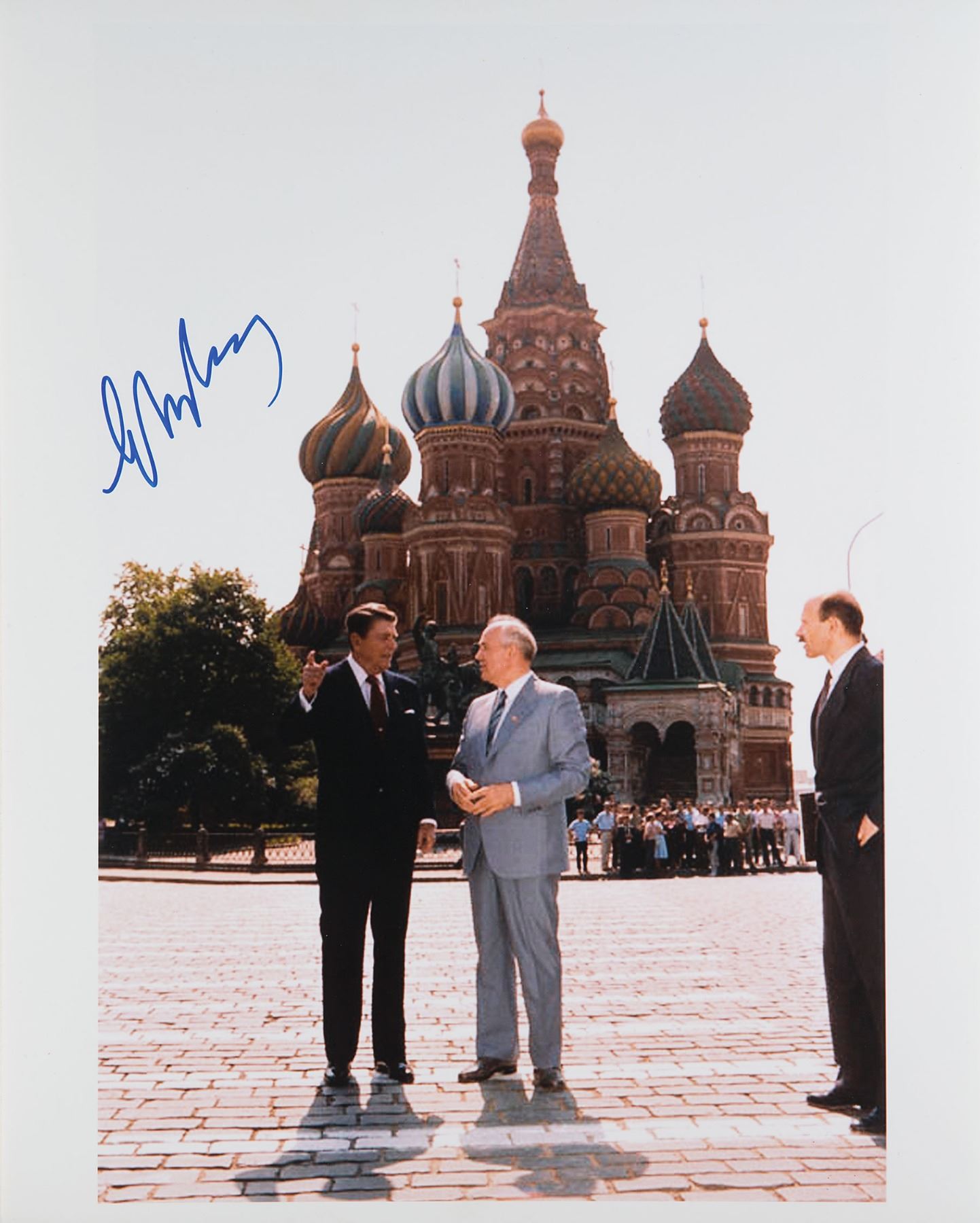 Color satin-finish 12 x 15 full-length photo of Mikhail Gorbachev meeting with Ronald Reagan at the Kremlin, signed in blue felt tip by the former Soviet leader. In fine condition, with somewhat grainy image quality.
