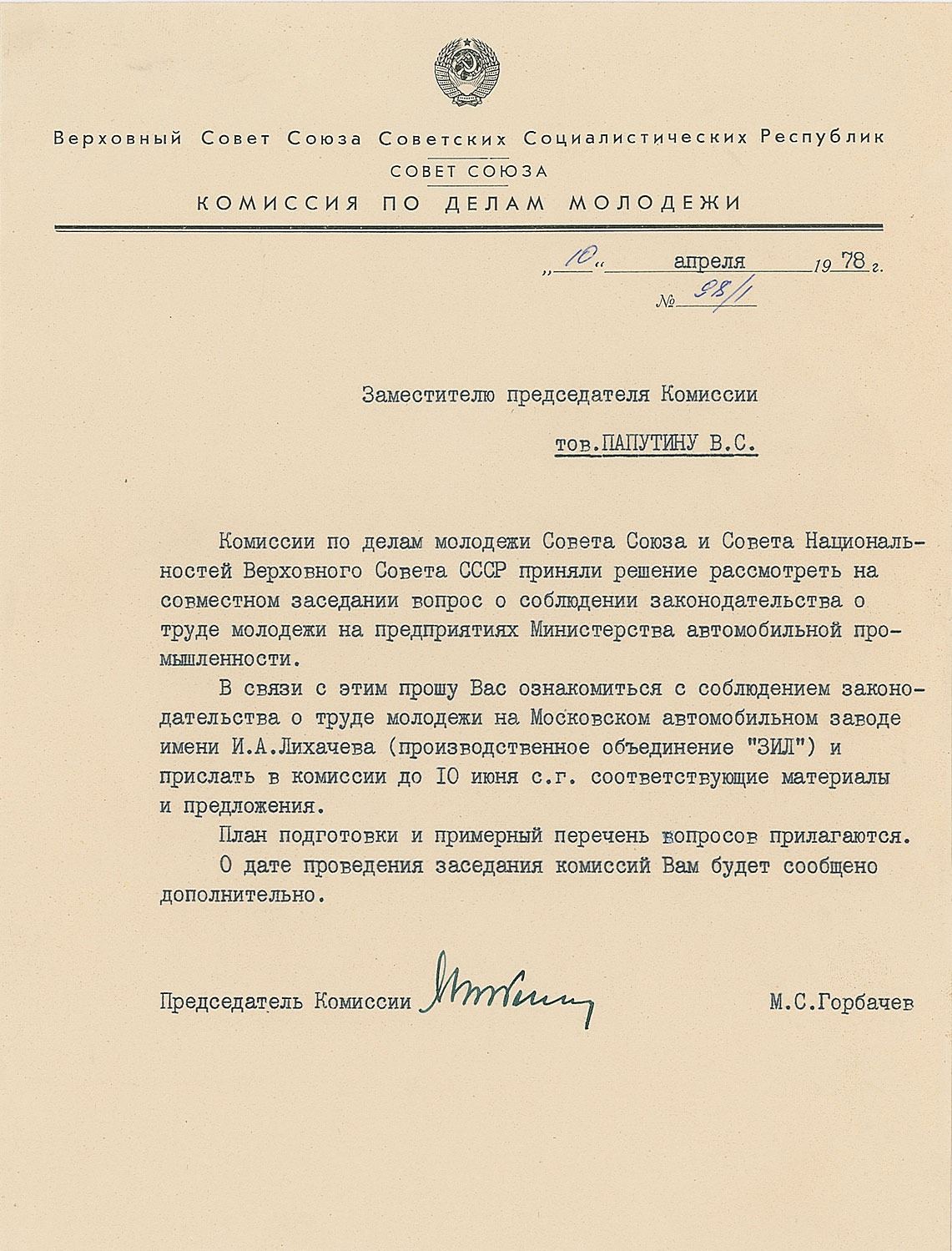 Untranslated DS in Cyrillic, one page, 8.25 x 10.75, April 10, 1978. Signed at the conclusion in fountain pen by Gorbachev. In fine condition.