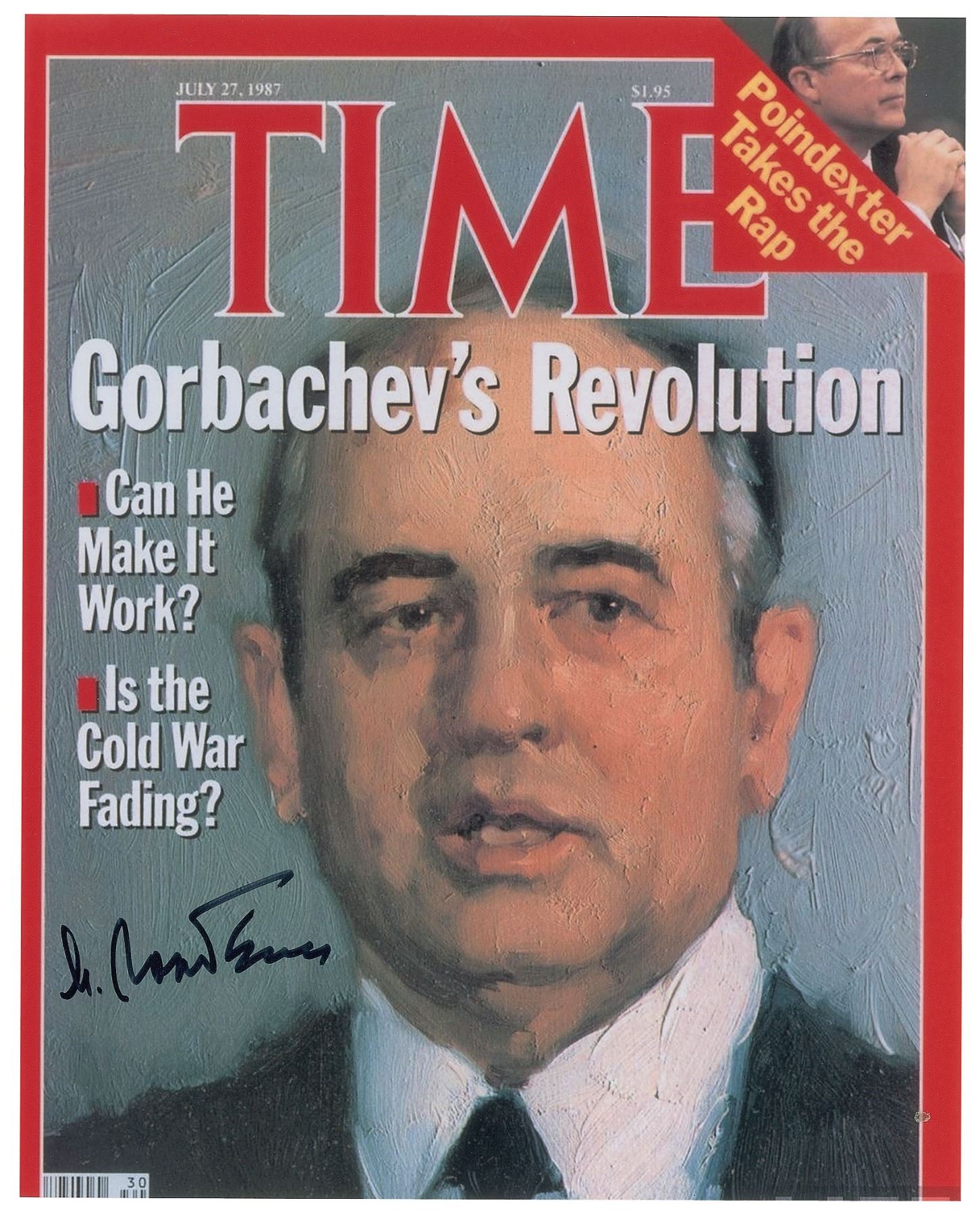 Two satin-finished photos: one color 8 x 6 photo of Gorbachev with his finger in the air, signed in black felt tip; and one color 8 x 10 photo of a Time magazine cover featuring Gorbachev, signed in black felt tip. In overall fine condition, with a light bend across the smaller photo.