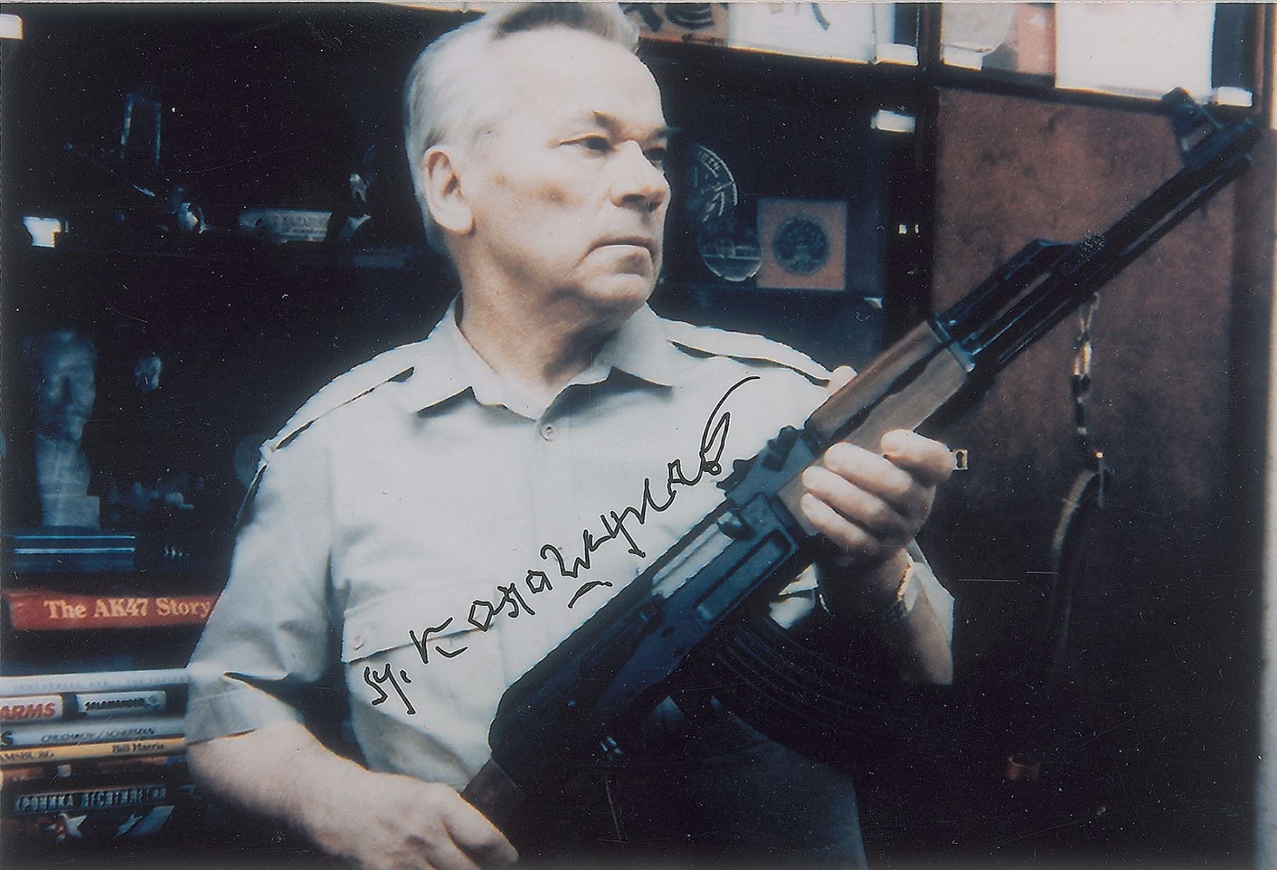 Russian general and inventor (1919–2013) most famous for developing the AK-47 assault rifle. Color glossy 6 x 4 photo of Kalashnikov holding one of his famous weapons, signed in black felt tip. In very fine condition.