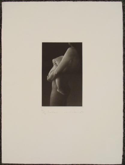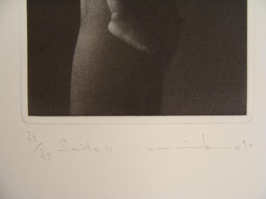 "During the slow process of engraving, as I scrape the burrs that I have incised on the copper plate and then polish it, the sensitivity which lies inside me can be revealed. Giving shape and light to what was before absolute darkness, I try to feel this universe of purity which exists deep inside the human body," says the artist Mikio Watanabe. Perhaps it is this deeply felt process that makes Watanabe's mezzotints so beautiful: Title: "Suite II" ("Series II") Year: 1990 Medium: Mezzotint on BFK Rives paper with deckled edges Edition: Last in series, 75/75 Signature: In pencil in the margin LR Sheet: 11 × 15 Image: 3¾ × 5¾ Good condition; slight creasing in lower margin; some rippling image area--could probably be lessened with proper matting; Reflected in the opening bid Certificate of AuthenticityWatanabe creates a mezzotint by repeatedly pressing a curved, serrated mezzotint rocker over the surface of a copper plate until has received many thousands of tiny indentations from this tool. This procedure is extremely time-consuming - most of the plates take 70 - 80 hours to produce - but plates made this way yield velvety blacks that can be obtained no other way. After the entire surface of the plate has been roughened, scraper and burnishers are used to raise tones of gray and white.