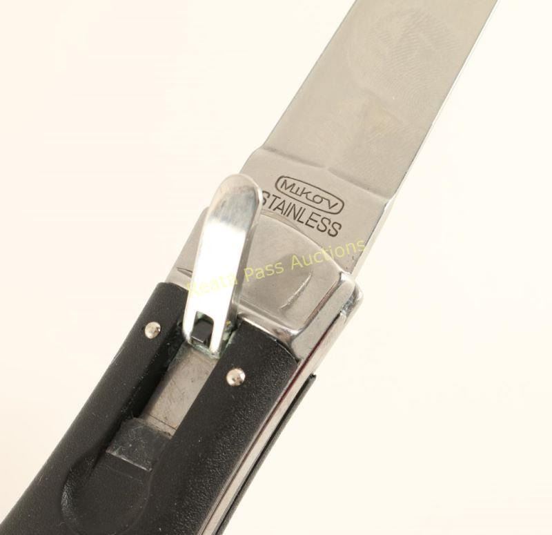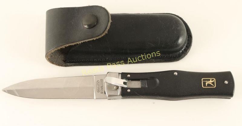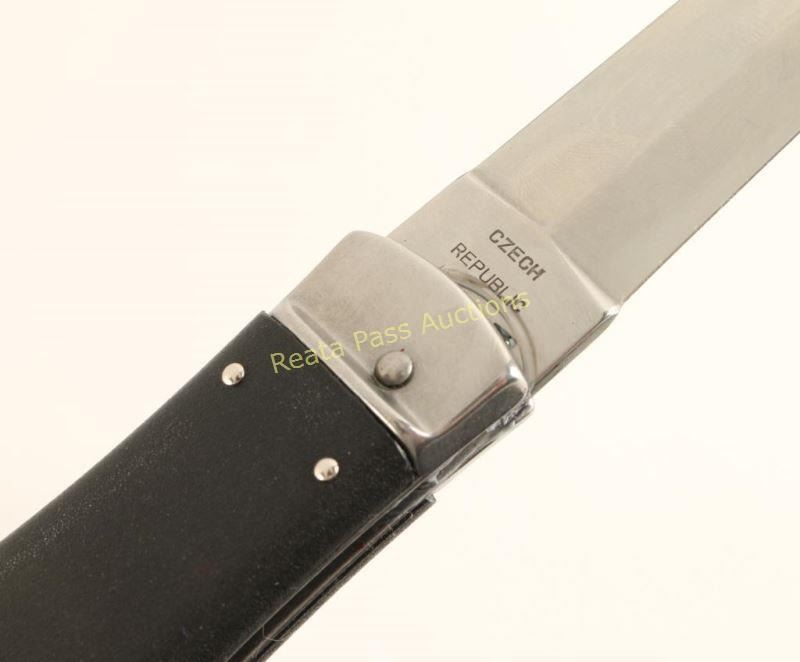 Made in Czech Republic with stainless steel blade, black plastic handle, 8.5" overall 3.5" blade. Comes in black leather sheath.