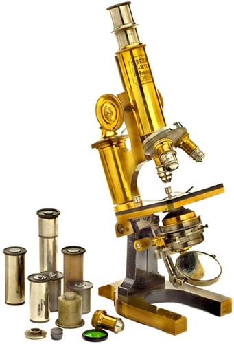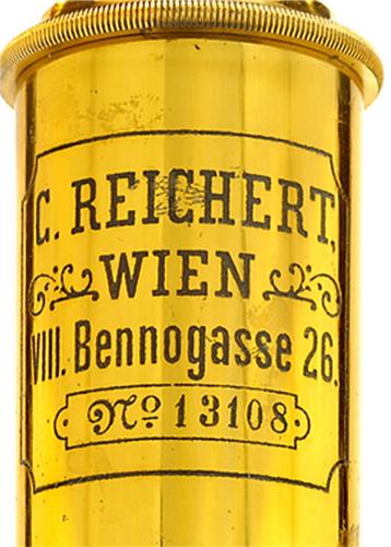 Mikroskop "Reichert" Schönes Mikroskop von C. Reichert, Wien, mit guter Lackierung, Mahagonikasten, 4 Objektive, 7 Okulare, Kondensor, Spiegel und Kleinteile. Attractive brass microscope by Reichert, Vienna With a lot of accessories. – (3/3) – € 300/400 – (306/31)