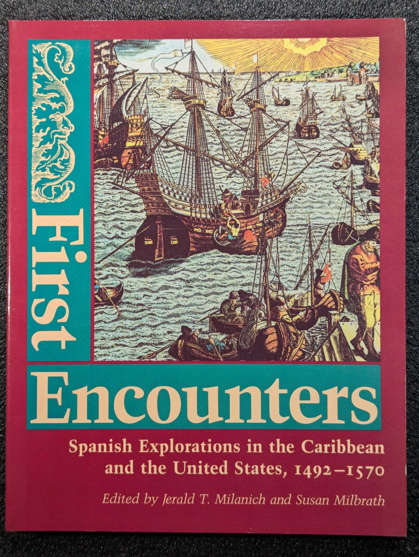 Milanich, Jerald T. & Susan Milbrath [editors]. FIRST ENCOUNTERS - SPANISH EXPLORATIONS IN THE CARIBBEAN AND THE UNITES STATES, 1492 - 1570. University of Florida Press, Gainesville. 1991. 4to. (8), 222 pages. original pictorial card covers. Third printing. Bibliography. B&w and color historic, artifact and coin photos,maps, prints and line illustrations throughout. English text. The David Baker Library. Fine. Drawing on the most recent historical and archaeological research, First Encounters describes the period of early Spanish contact with New World peoples. This series of highly readable essays reports original research and investigations mounted over the last ten years, a decade of remarkable breakthroughs in our knowledge about significant events in the first decades after 1492.