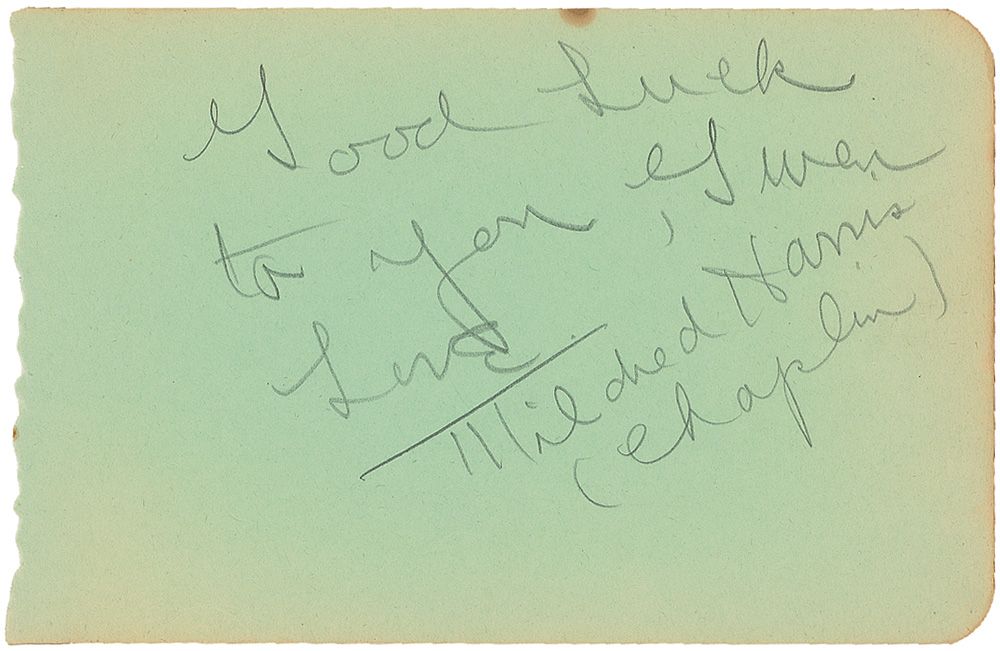 Film actress (1901-1944) who began her career as a popular child star in silent movies. She married Charlie Chaplin in 1918 only to separate the next year after the death of their three day old child. Vintage pencil signature and inscription, “Good luck to you, Gwen, love, Mildred Harris (Chaplin),” on a light green 6 x 4 album page. In fine condition, with mild toning around the edges and a spot of soiling on the top edge.