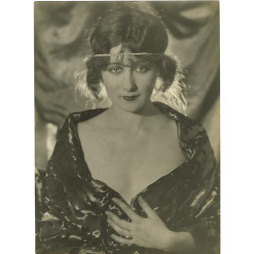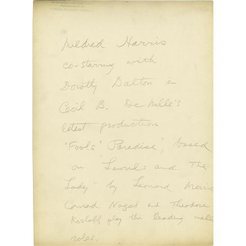 <B>Mildred Harris Photo from Cecil B. DeMille's "Fool's Paradise."</B></I> Silent star Mildred Harris (1901-1944) was the first wife of Charlie Chaplin, married to the comedian superstar from 1918 to 1920. After the loss of their child (born with severe disabilities, and who lived only three days) and her split from Chaplin, Mildred began an affair with the Prince of Wales and married two more times before her premature death. She also acted in over 130 films (ending her career in bit parts), and this superb 11" x 14" close-up photograph from Cecil B. DeMille's <I>Fool's Paradise</B></I> (1921) reveals Mildred Harris in her heyday, showcasing both the flamboyant glamour and the heartbreaking eyes of this sadly forgotten star. The verso has the stamp of the famed photographer Edwin Bower Hesser and some writing identifying the actress and including details about the film. A stunning portrait in Excellent condition.<BR><BR><b>Shipping:</b> Flat Material, Small (<a target="_blank" href="http://www.heritageauctions.com/common/shipping.php">view shipping information</a>)