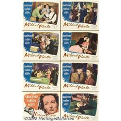 <B>Mildred Pierce (Warner Brothers, 1945)</B></I> Lobby Card Set of 8 (11" X 14"). "The kind of Woman most men want -- but shouldn't have!" Joan Crawford's Oscar-winning role is a wonderful portrait of a steel-spined woman determined to work to have the best for her family. A very classy soap opera, with outstanding performances from the entire cast. This is a marvelous lobby set from this film, with Crawford featured in all but two cards. Pinholes and slight soiling on all cards, a corner crease on two cards, a small tear in the bottom border on two cards. Overall, a very nice set of lobbies from this great title! Very Fine+. 8 items