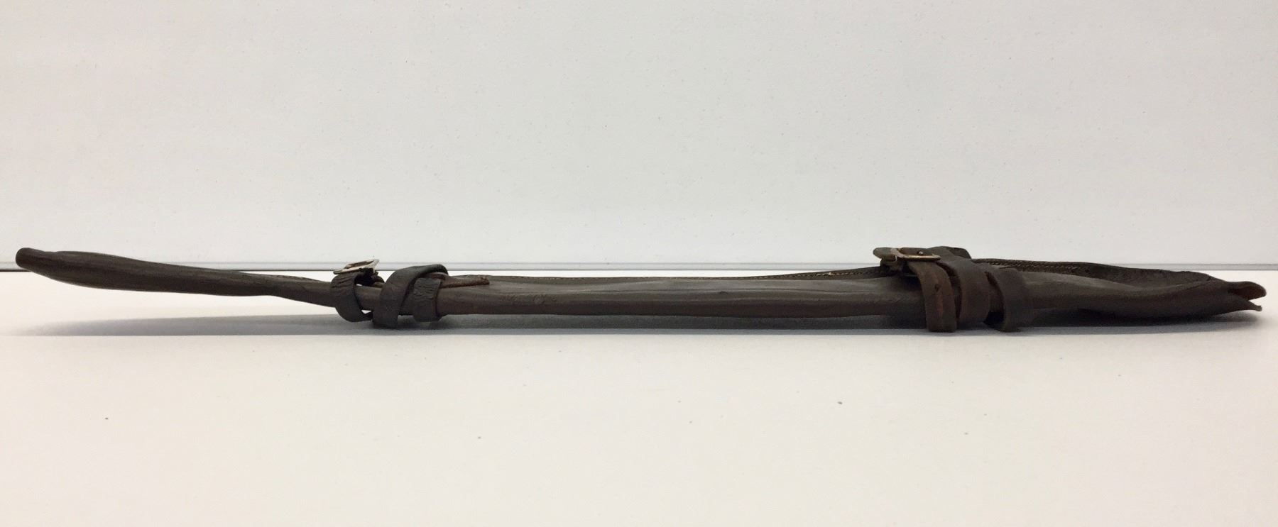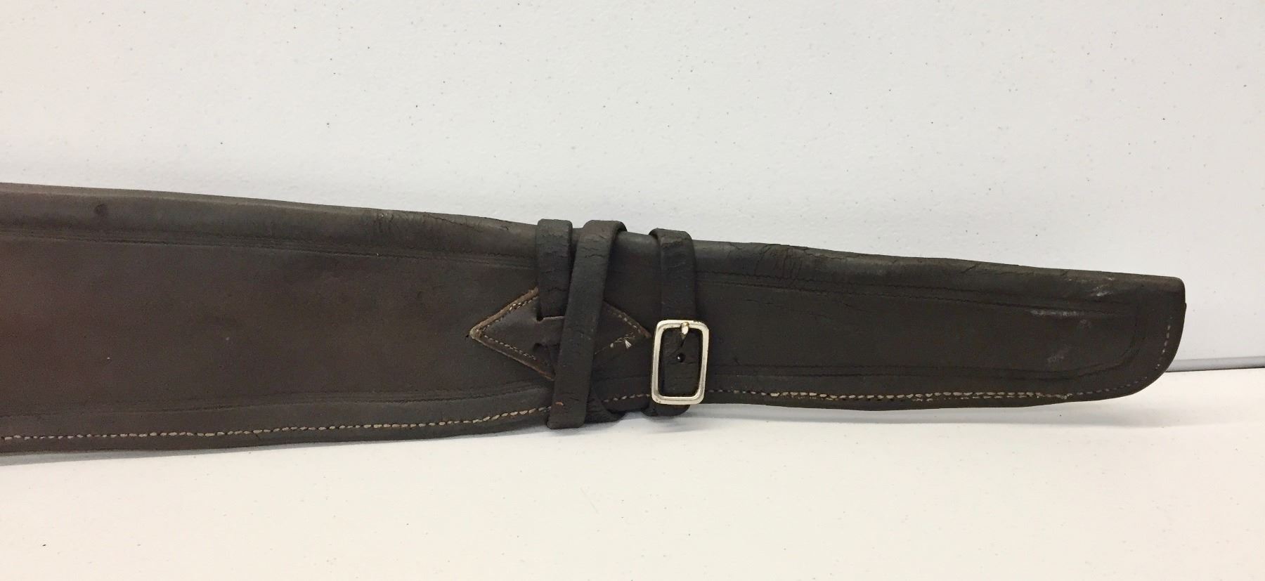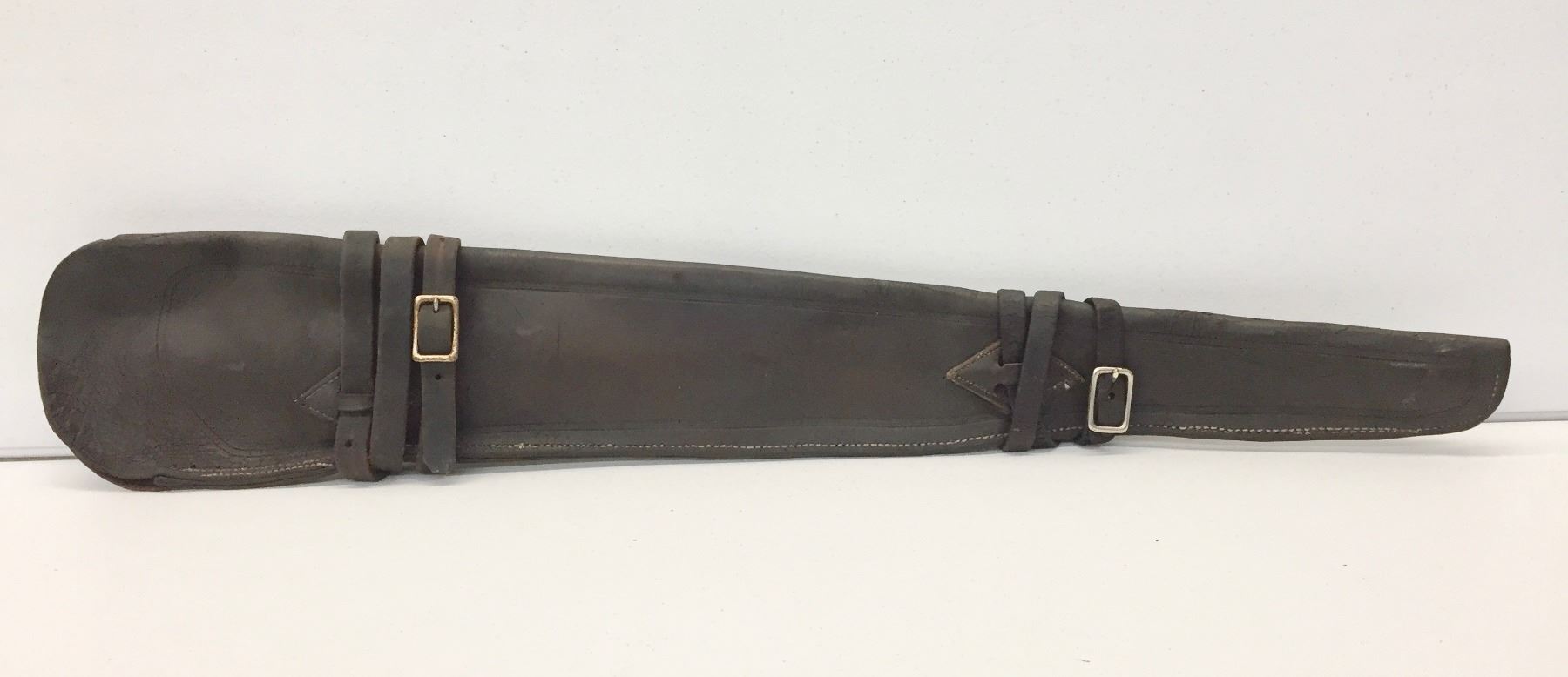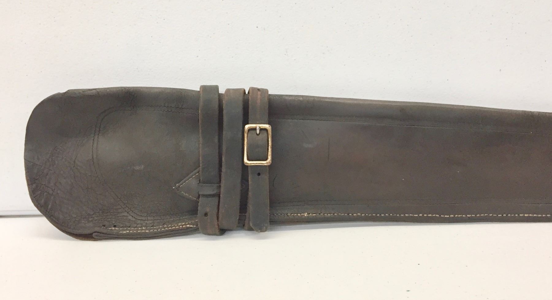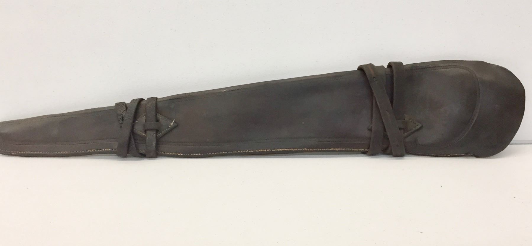 Description: For sale in this lot is an original, Miles City Saddlery marked, leather scabbard. The scabbard is made from top grain leather with a beautifully tooled pattern on each side. Maker: Miles City Saddlery Co., Miles City, MT. Approx. Age: Early 1900s. Size: 6-1/2”w x 36” long. Condition: Pretty good for its age, normal wear expected. Please look closely at the pictures - they are an important part of our description. Shipping: There will be a $7 handling / packaging fee for shipping this lot. The actual cost of postage will be added on top of that.