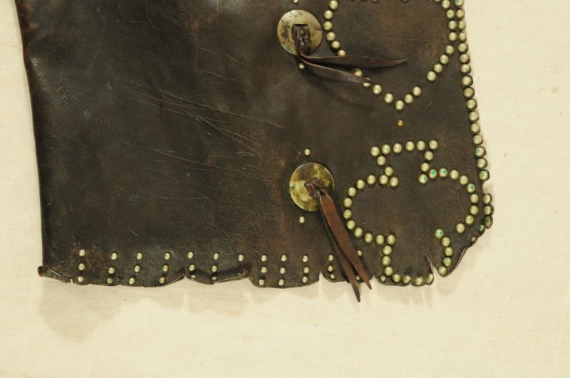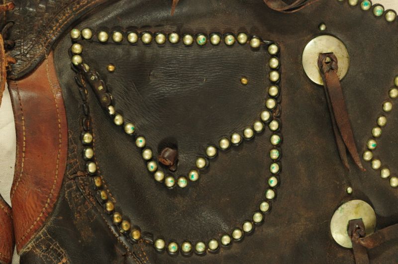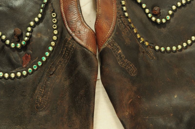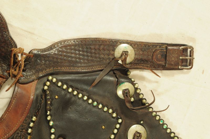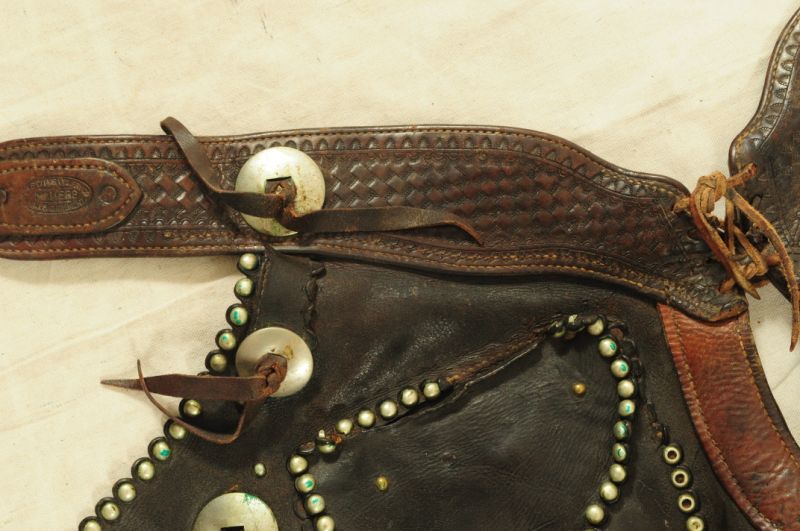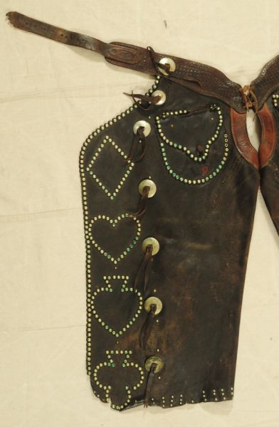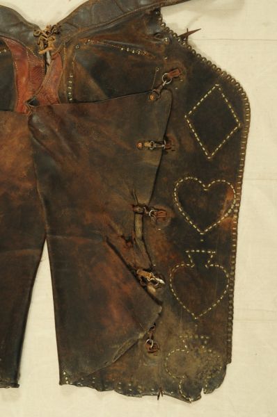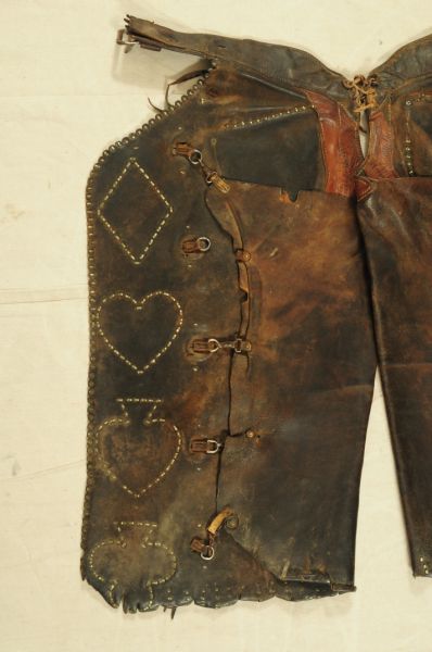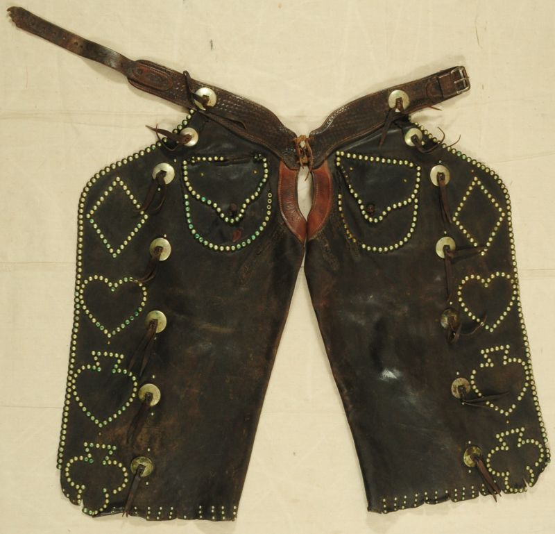 Miles City Saddlery Card Suit Gamblers Chaps. Marked -- Miles City Saddlery Co. MAKER Miles City Mont.-- With several old repairs & they appear to have been cut down & spots added along the bottom many years ago.