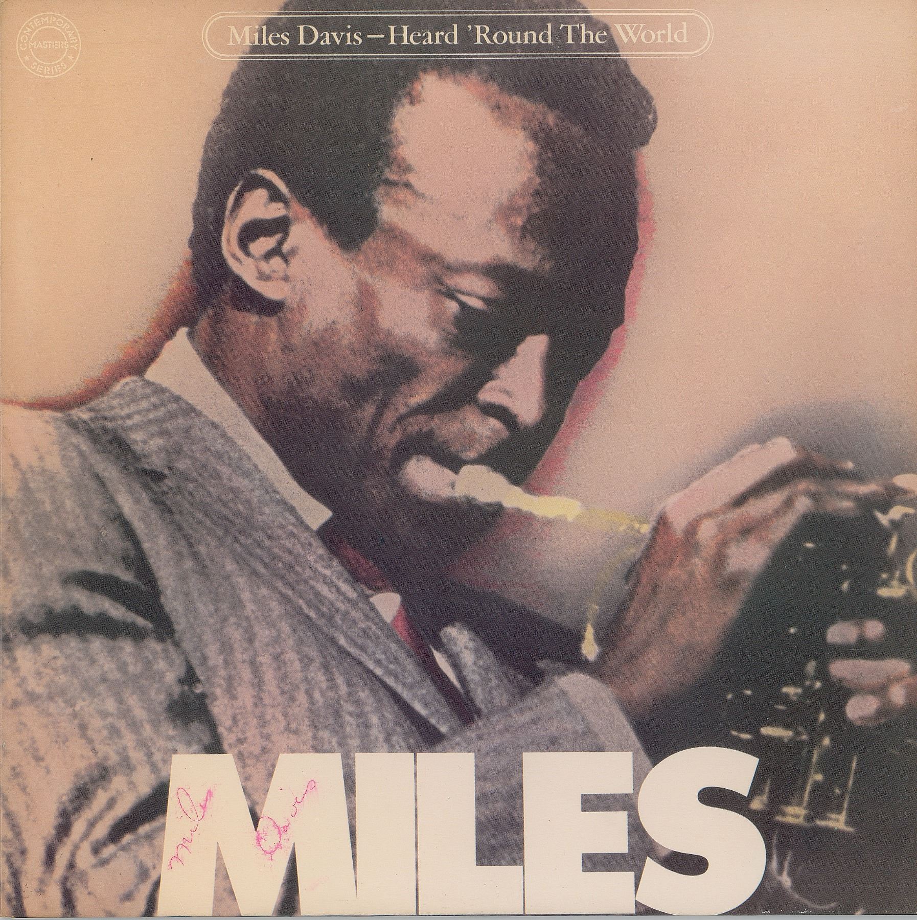Heard 'Round the World album signed on the front cover in red ink, "Miles Davis." In fine condition, with some smudging to ink. The records are included.